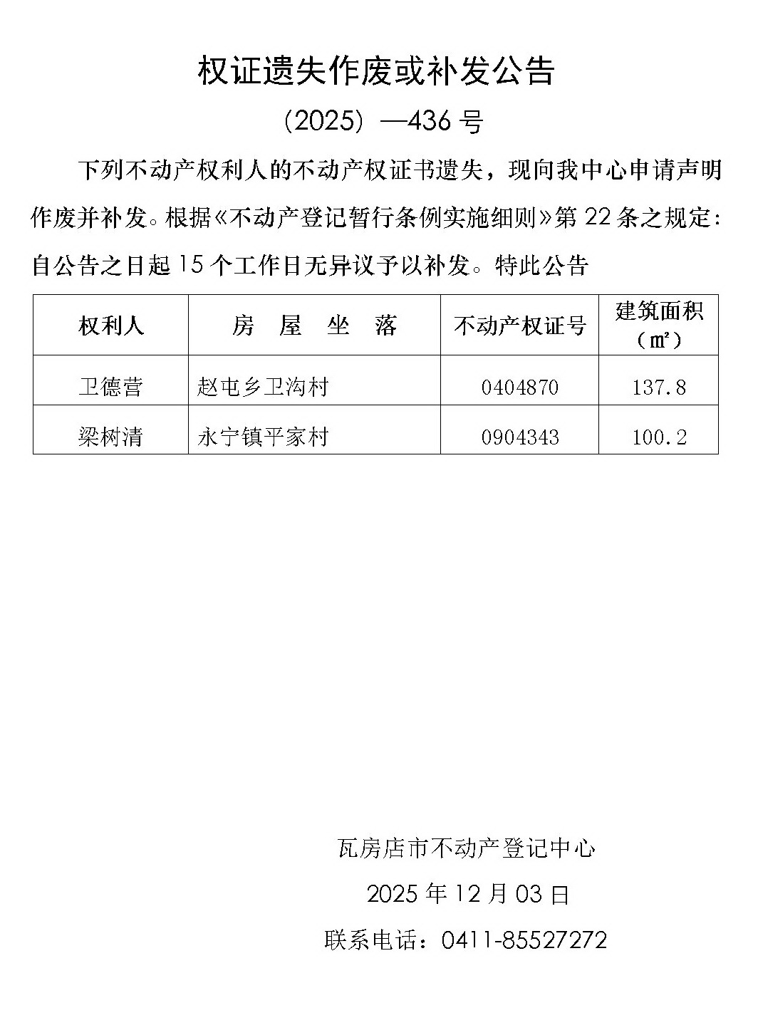 权证遗失作废或补发公告 (2025)-436号