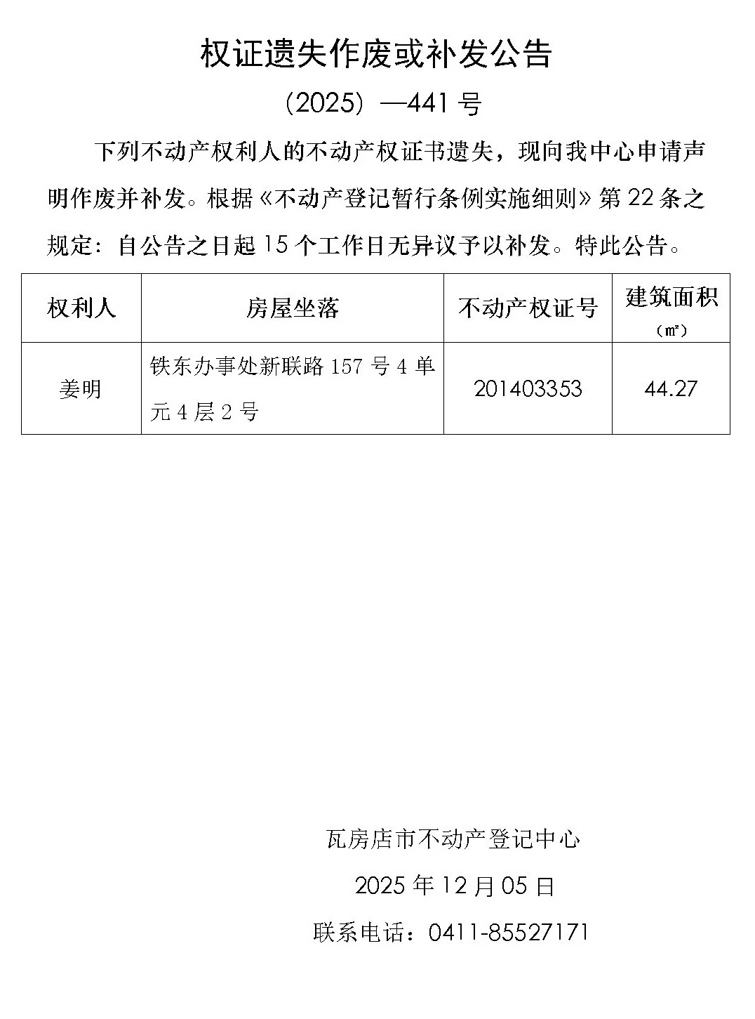 权证遗失作废或补发公告 (2025)-441号
