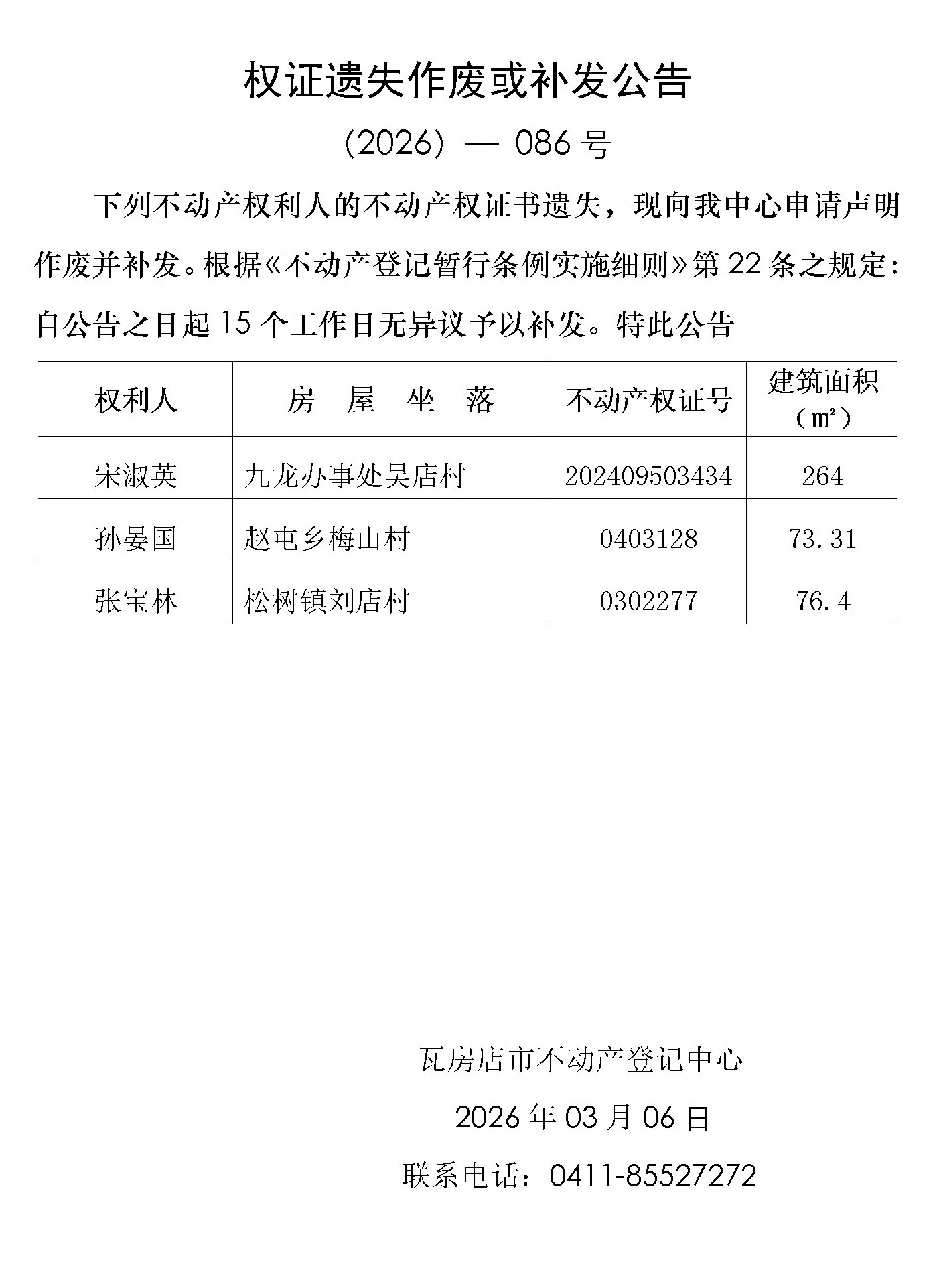 注销不动产权利证书公告 (2026)-085号