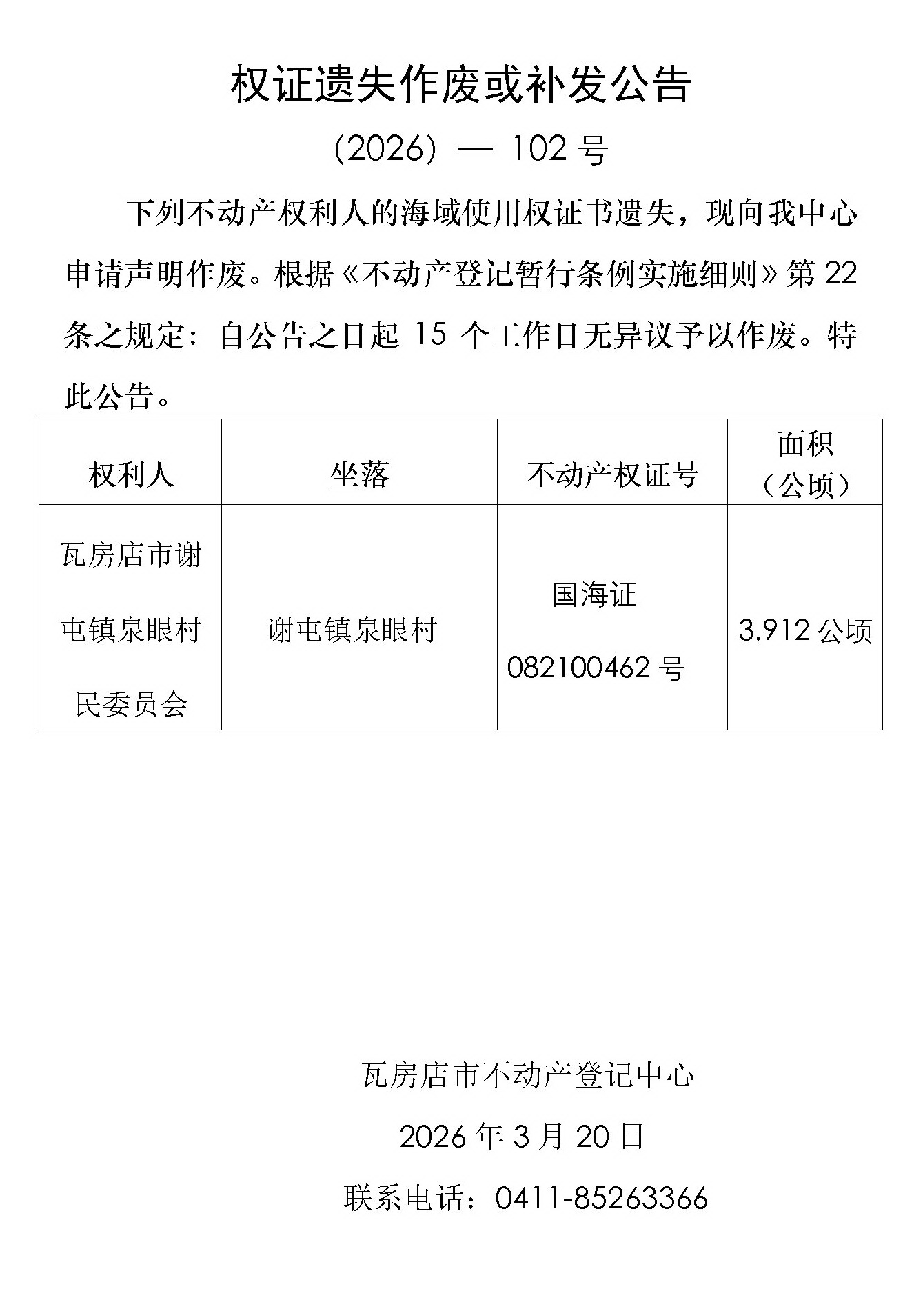 权证遗失作废或补发公告 (2026)-102号
