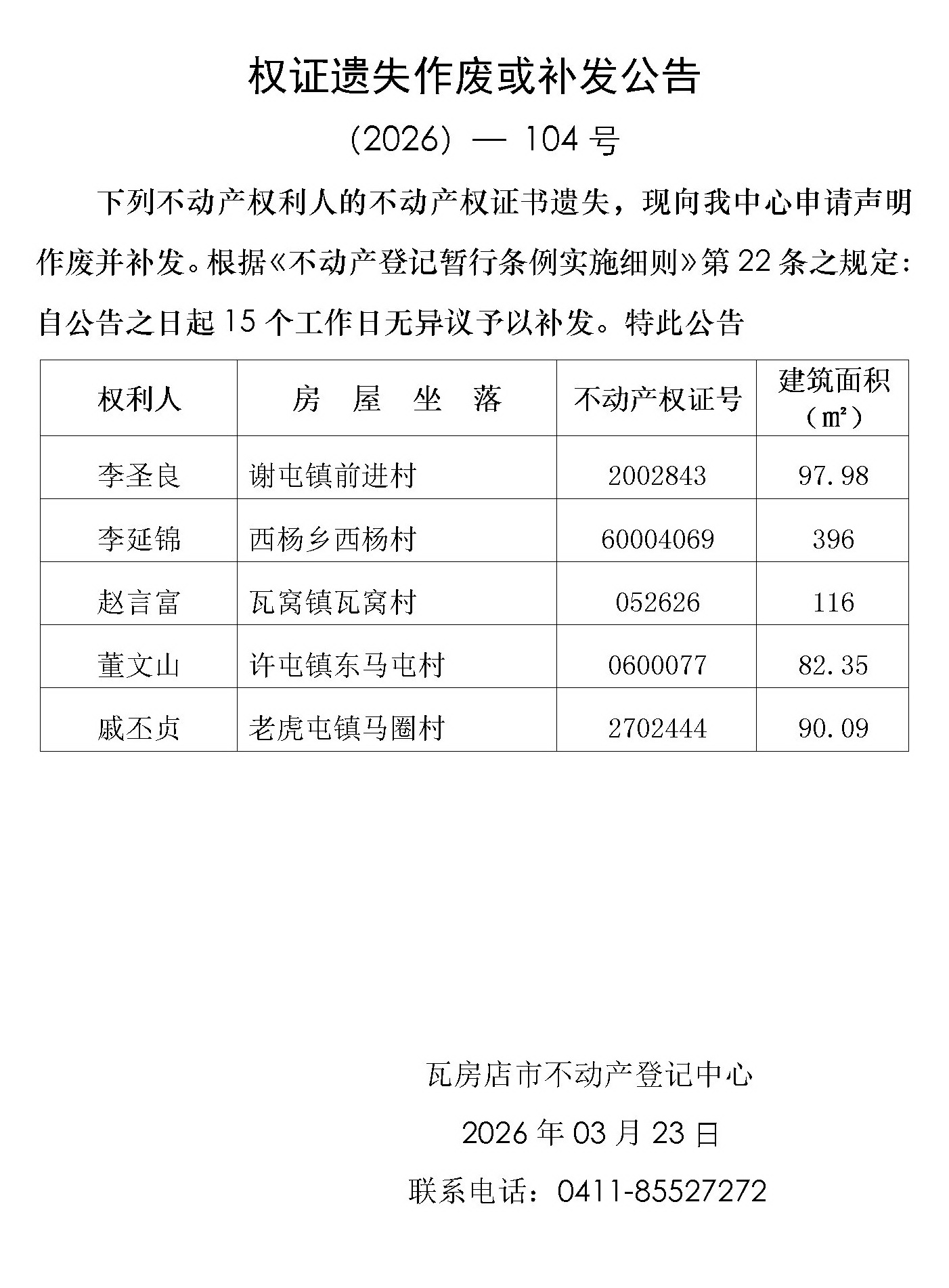权证遗失作废或补发公告 (2026)-104号