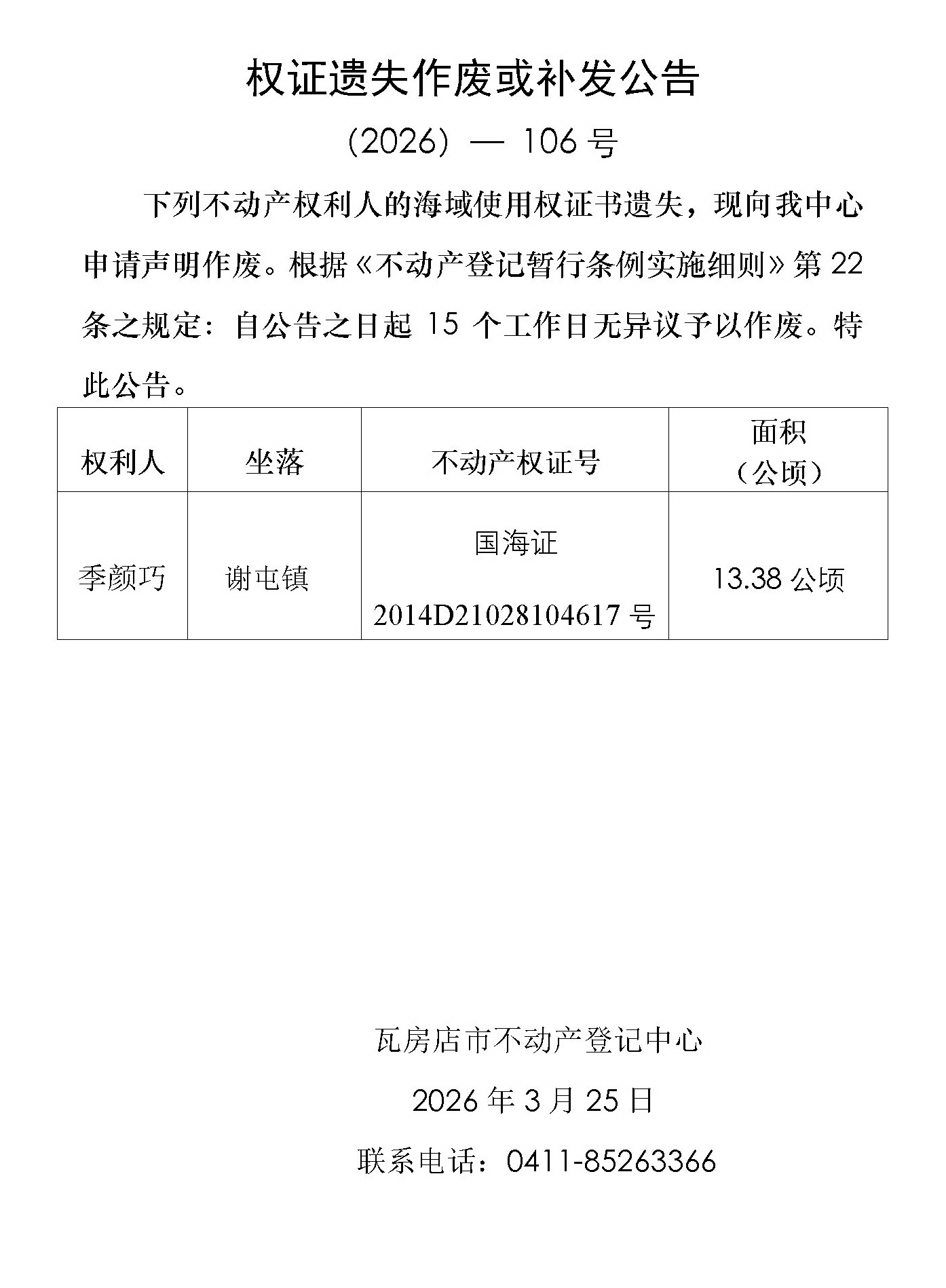 权证遗失作废或补发公告 (2026)-106号