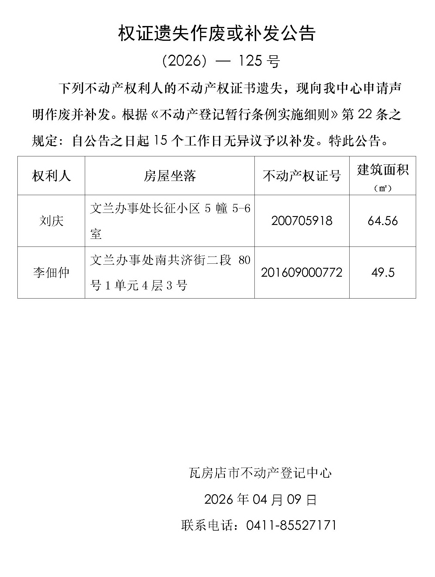 宅基地使用权及房屋所有权首次登记公告 (2026)-126号