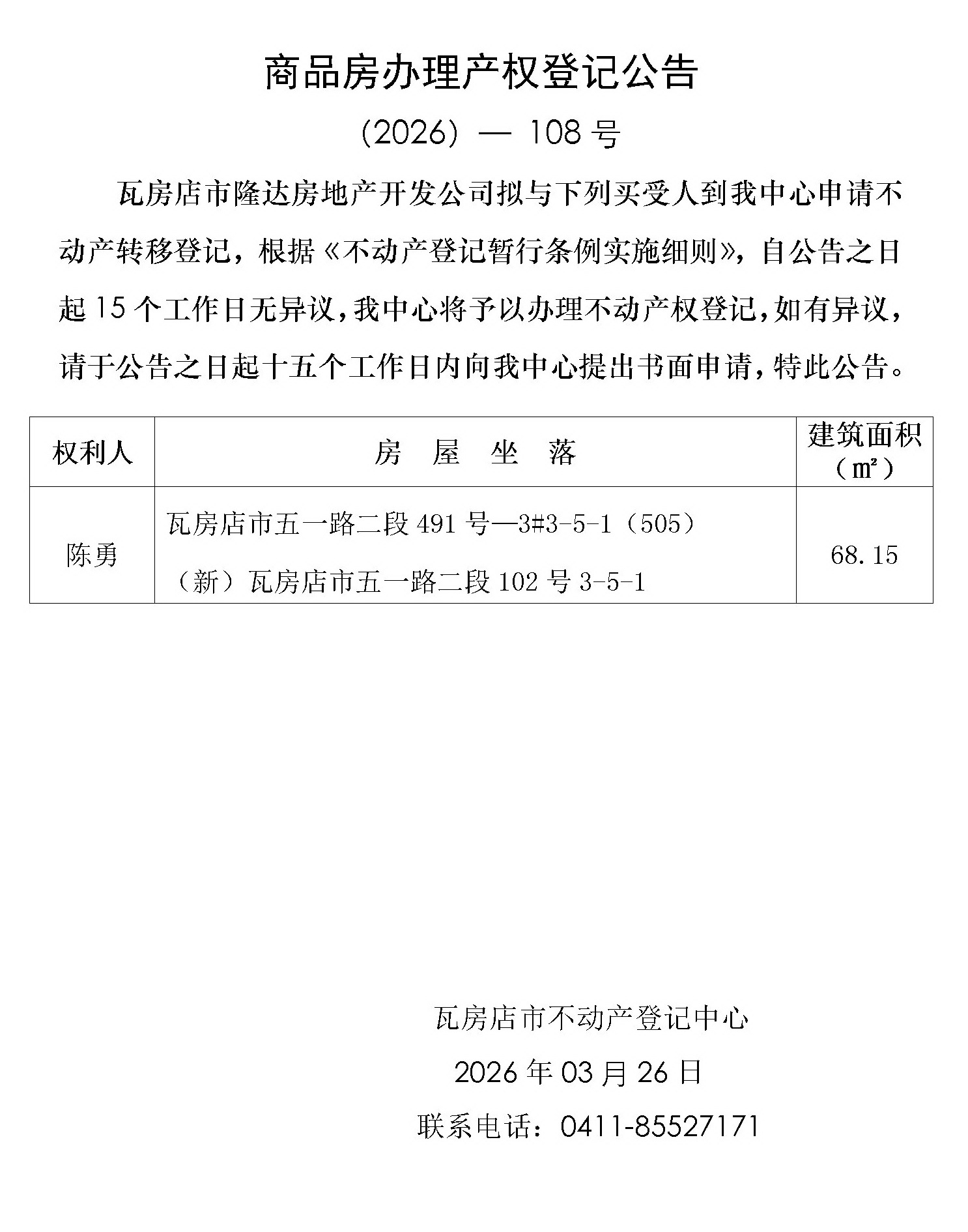 商品房办理产权登记公告 (2026)-108号
