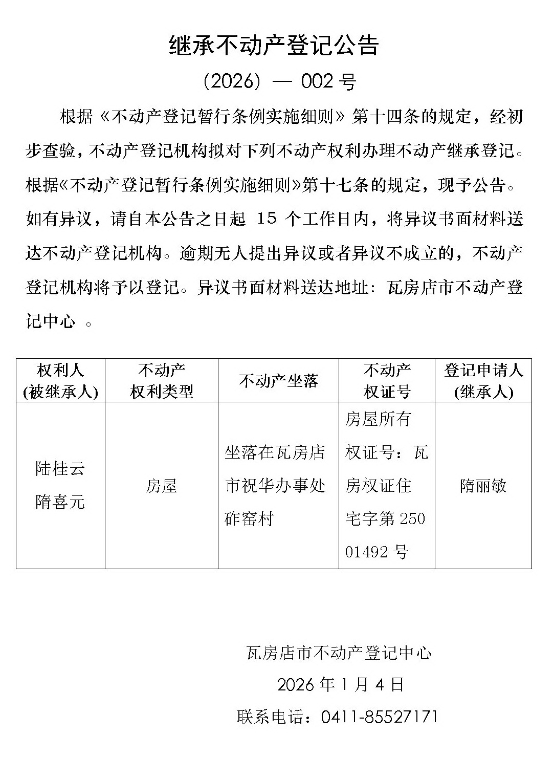 继承不动产登记公告 (2026)-002号