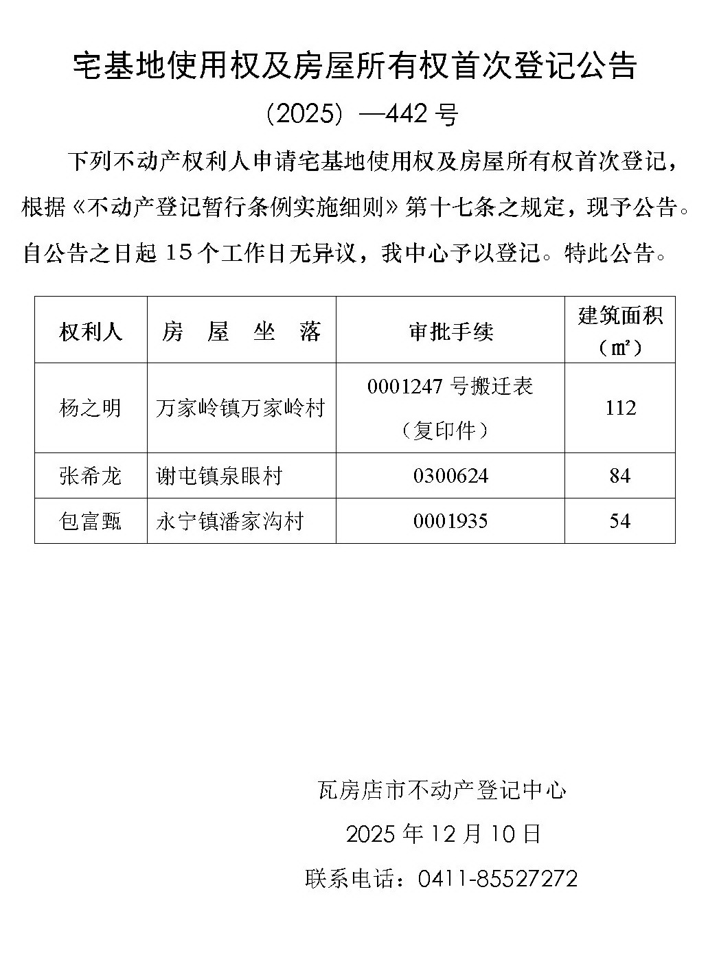 宅基地使用权及房屋所有权首次登记公告 (2025)-442号