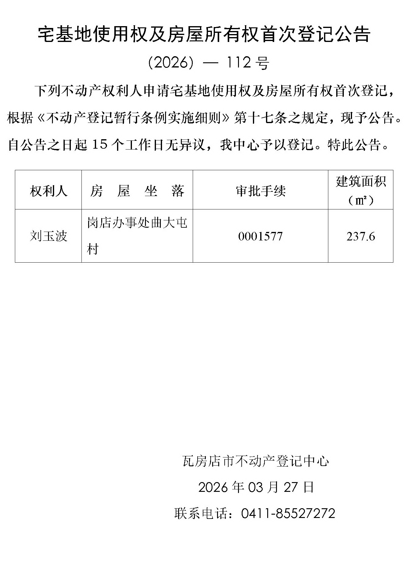 宅基地使用权及房屋所有权首次登记公告 (2026)-112号