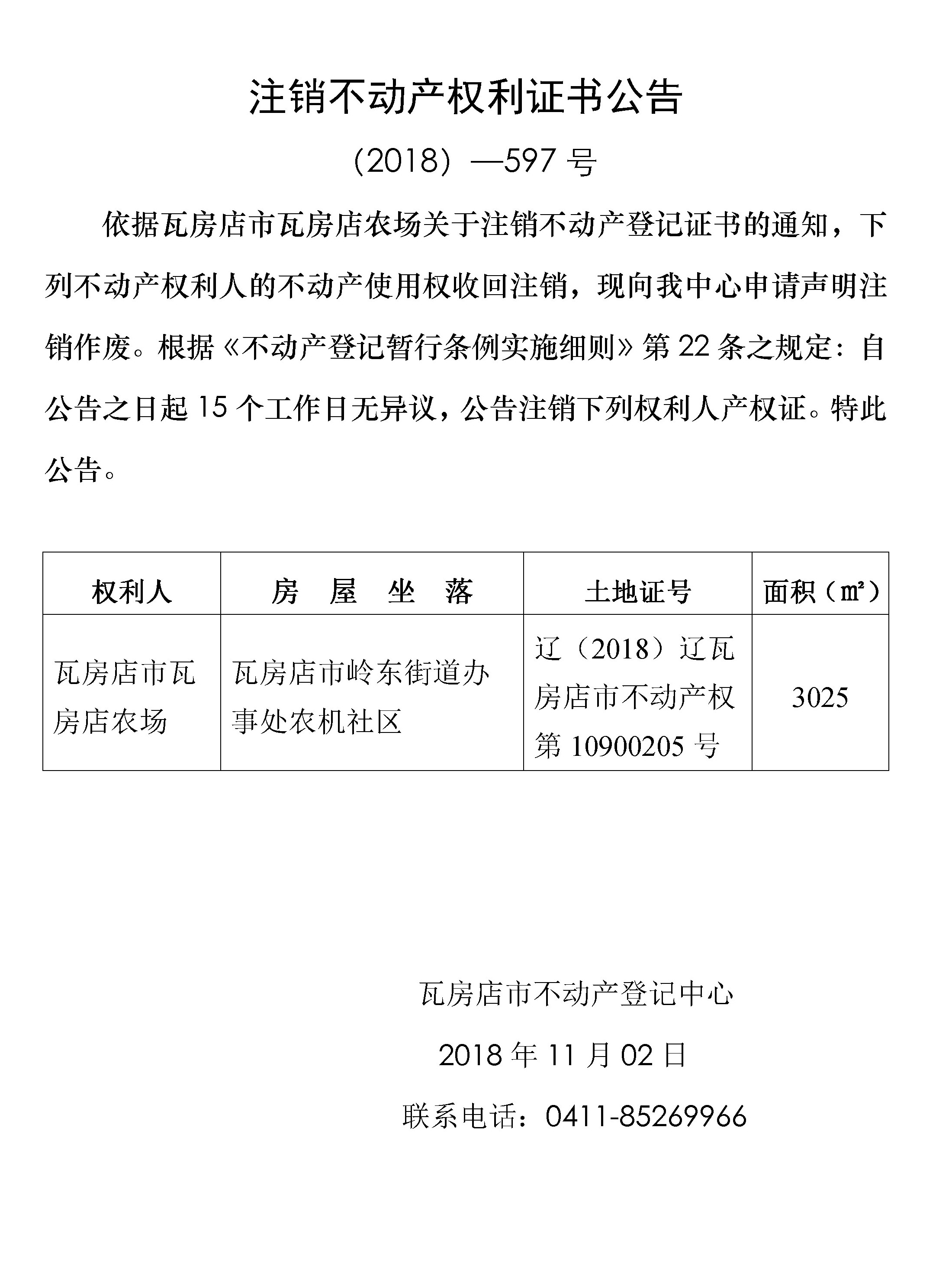 注销不动产权利证书公告 (2018)-597号