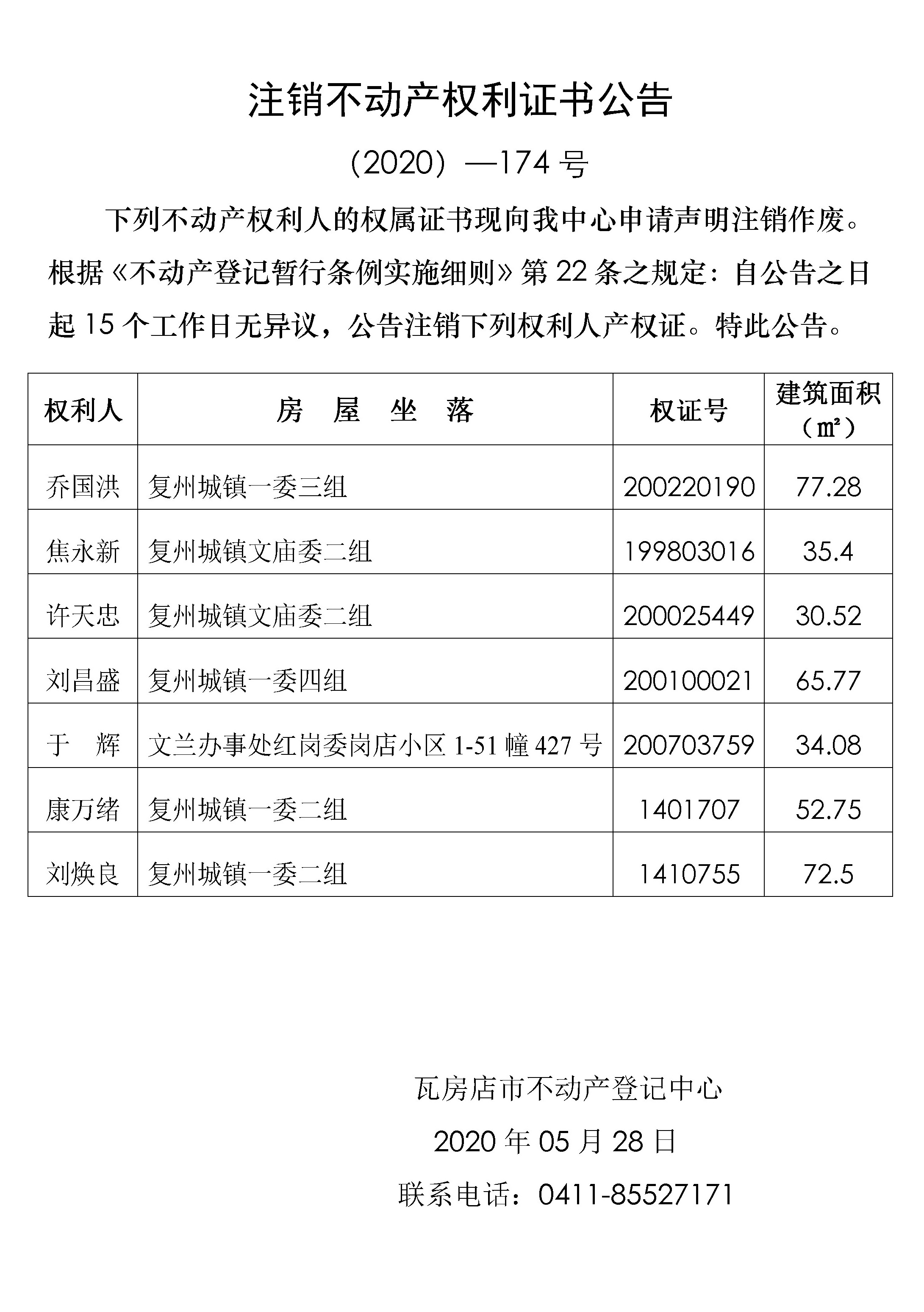 宅基地使用权及房屋所有权首次登记公告 (2020)-175号