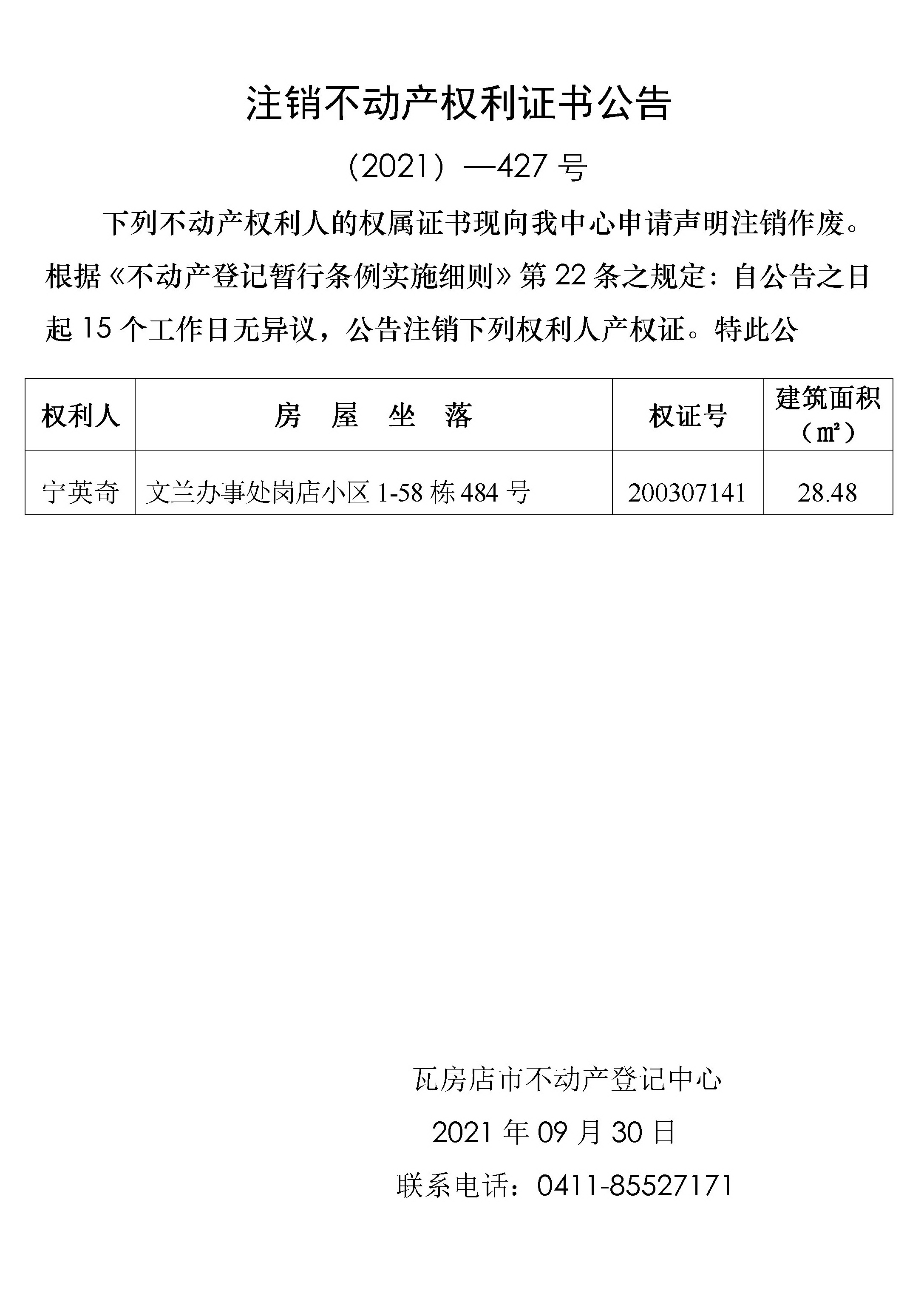 宅基地使用权及房屋所有权首次登记公告 (2021)-426号