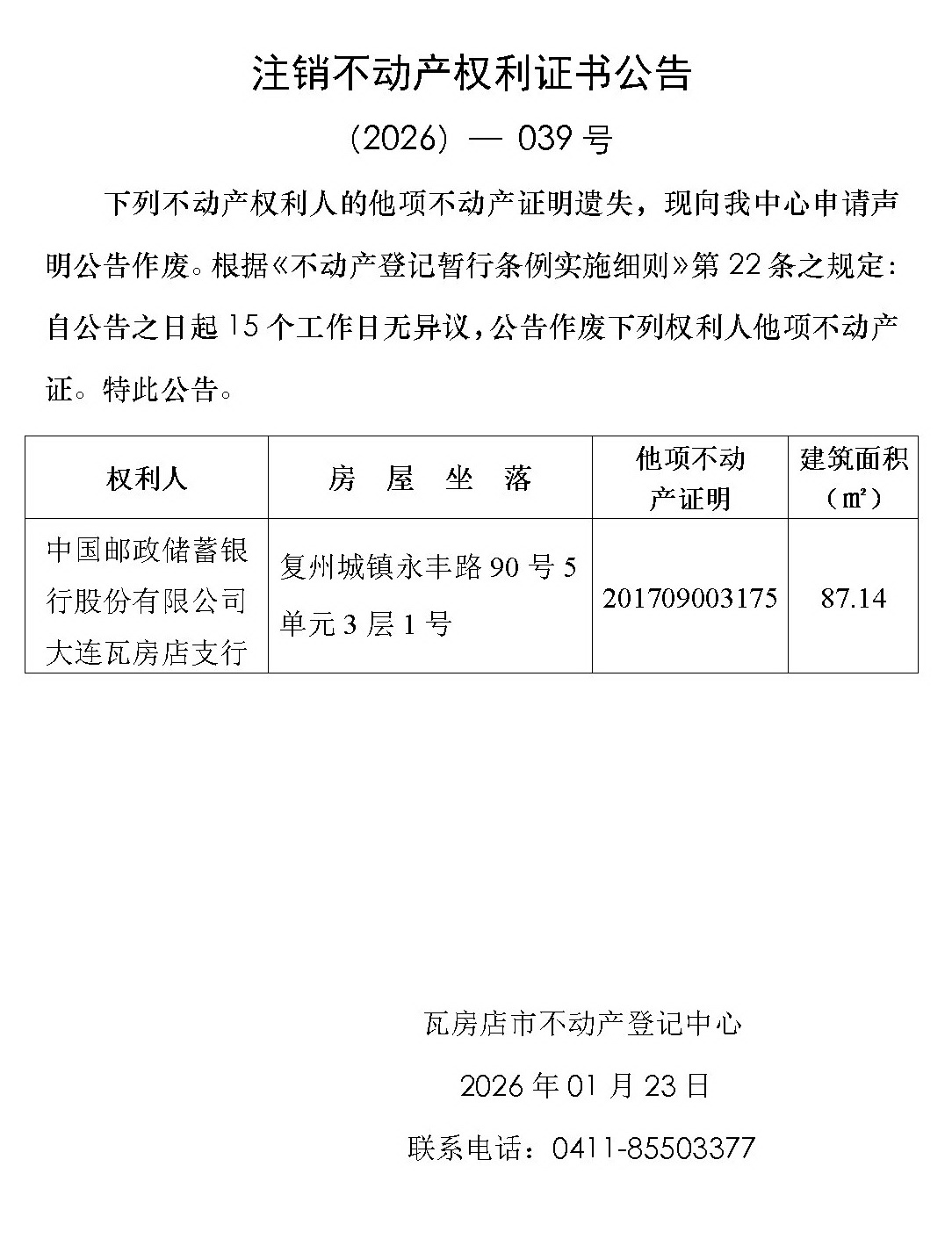 注销不动产权利证书公告 (2026)-039号