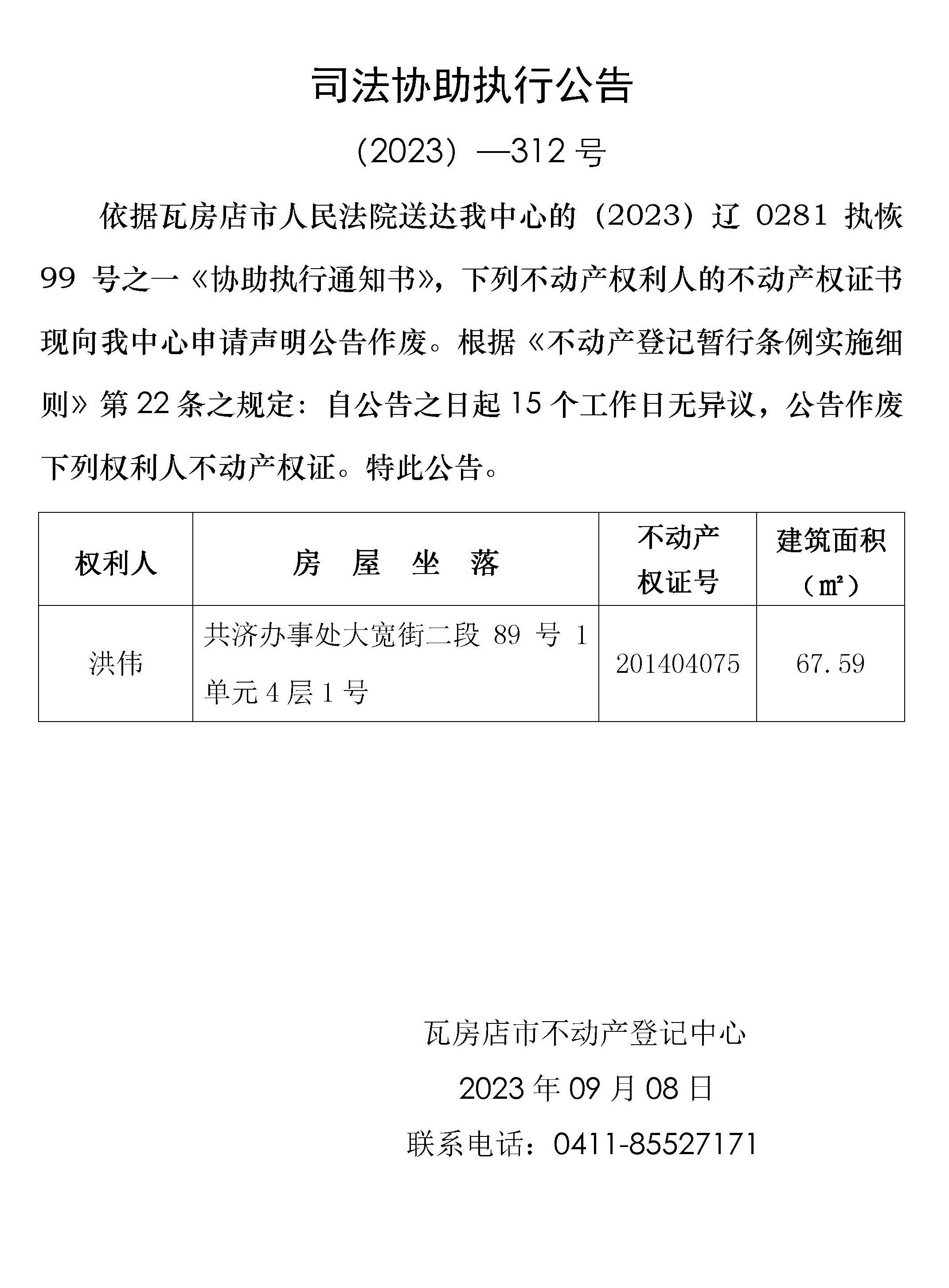 司法协助执行公告 (2023)-312号