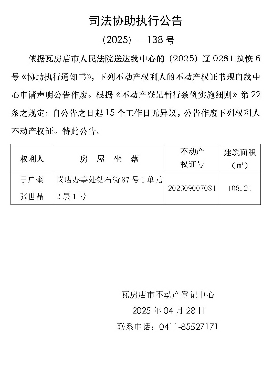 司法协助执行公告 (2025)-138号