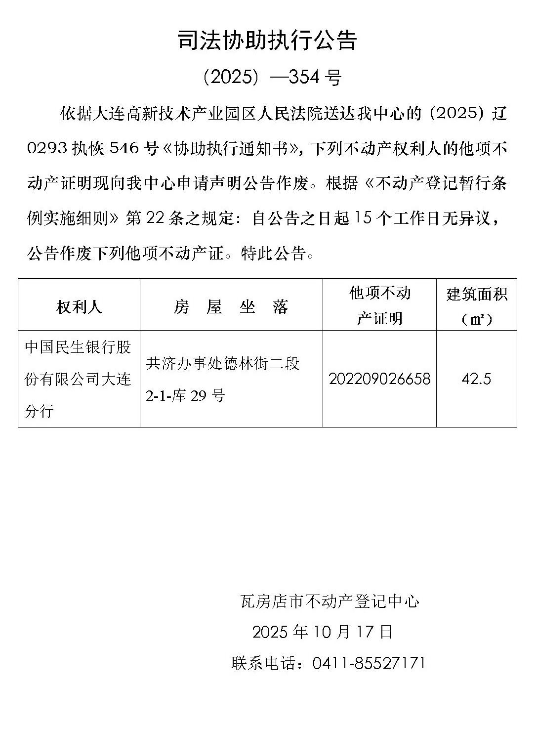 司法协助执行公告 (2025)-354号