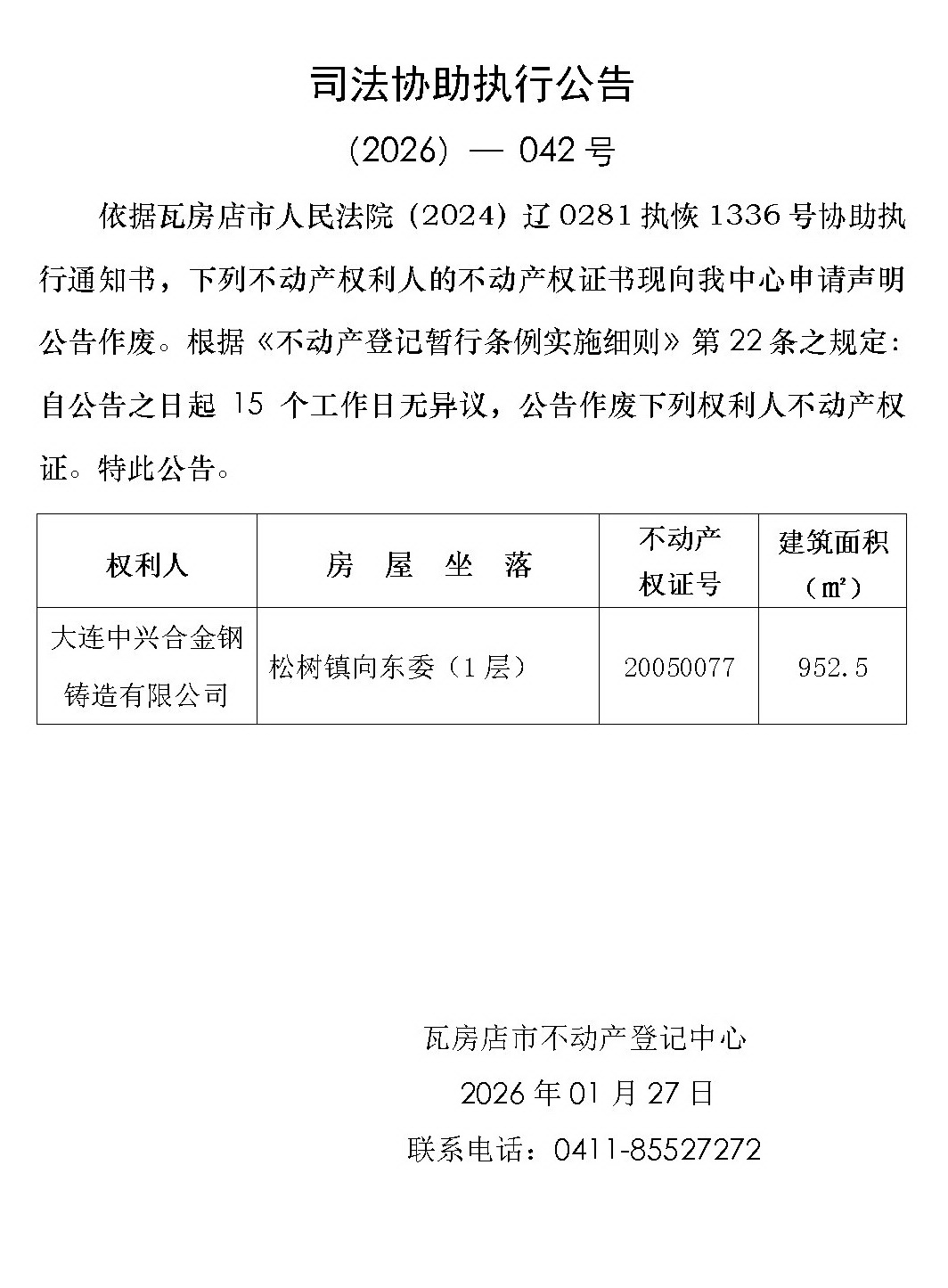 司法协助执行公告 (2026)-042号