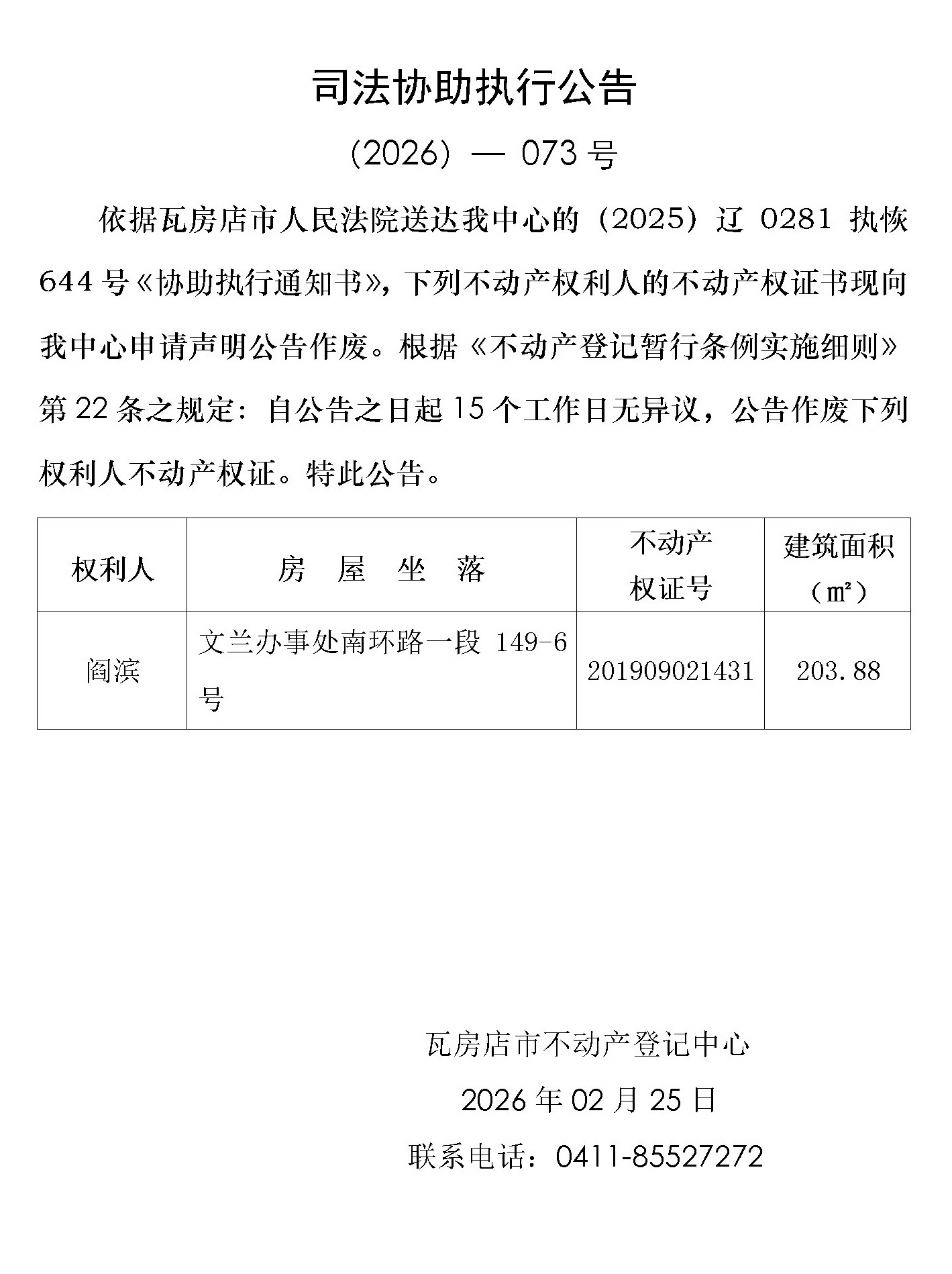 司法协助执行公告 (2026)-073号