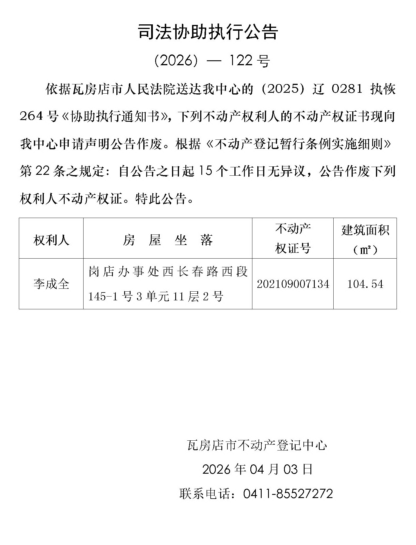 宅基地使用权及房屋所有权首次登记公告 (2026)-121号