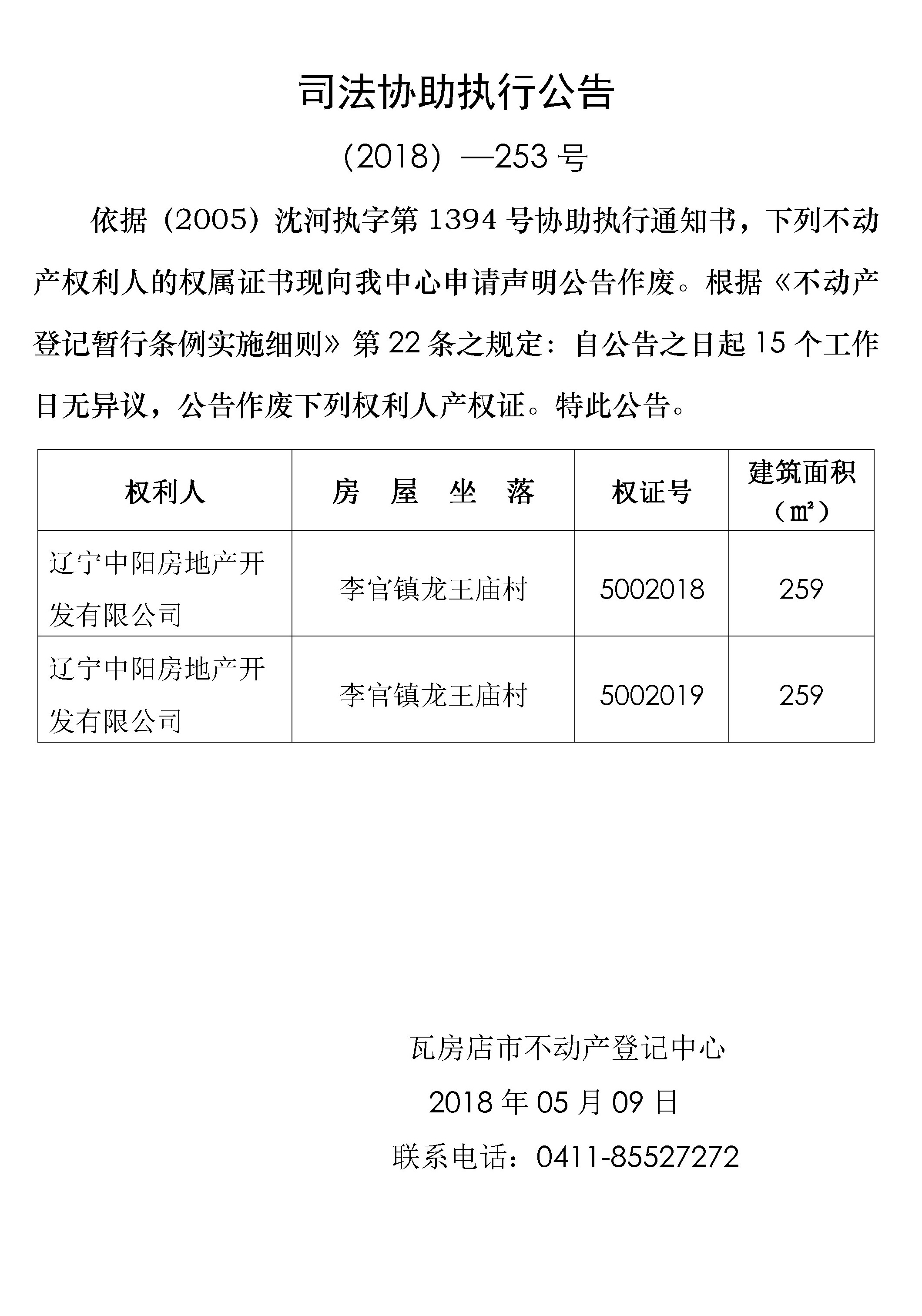 宅基地使用权及房屋所有权首次登记公告 (2018)-252号