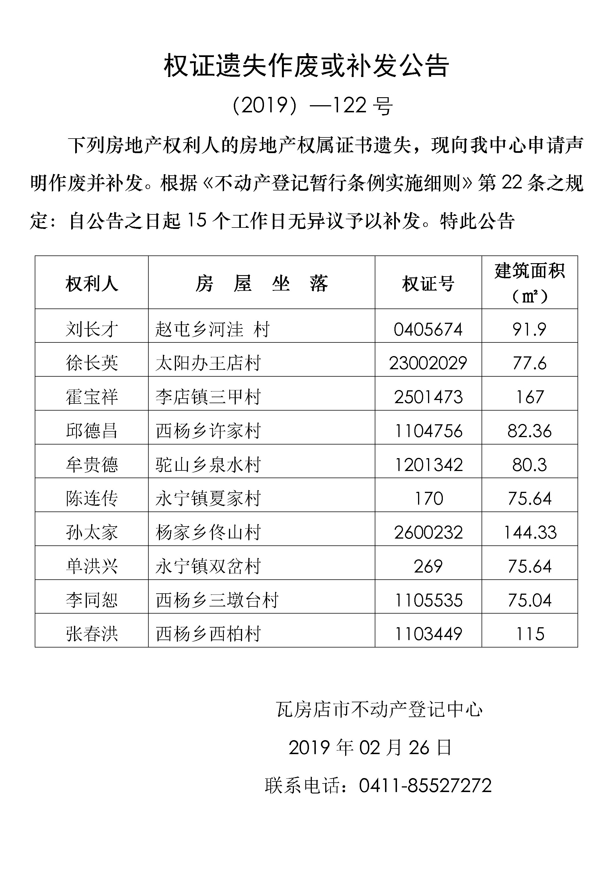宅基地使用权及房屋所有权首次登记公告 (2019)-121号