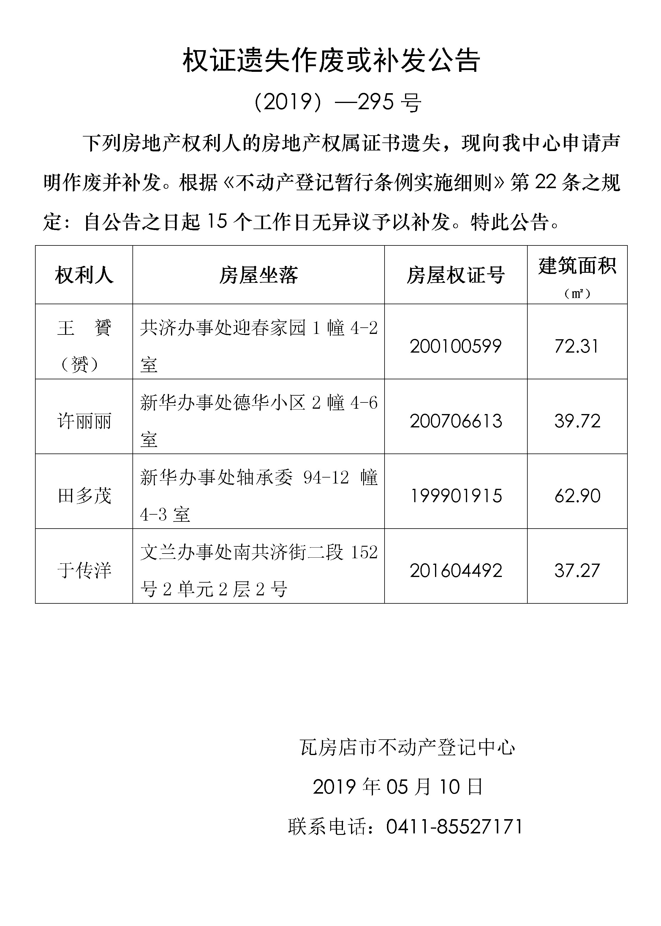 宅基地使用权及房屋所有权首次登记公告 (2019)-296号