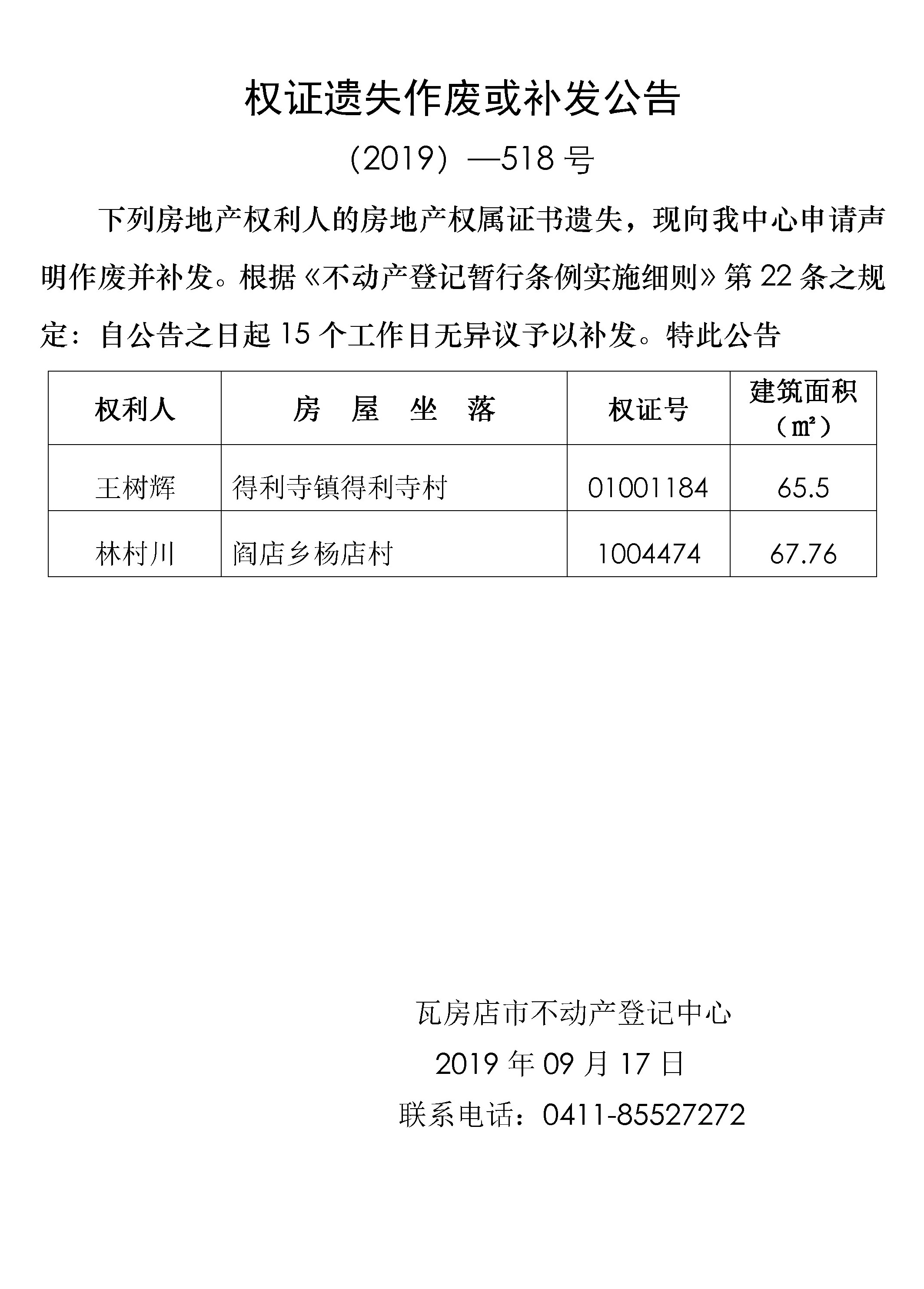 宅基地使用权及房屋所有权首次登记公告 (2019)-517号