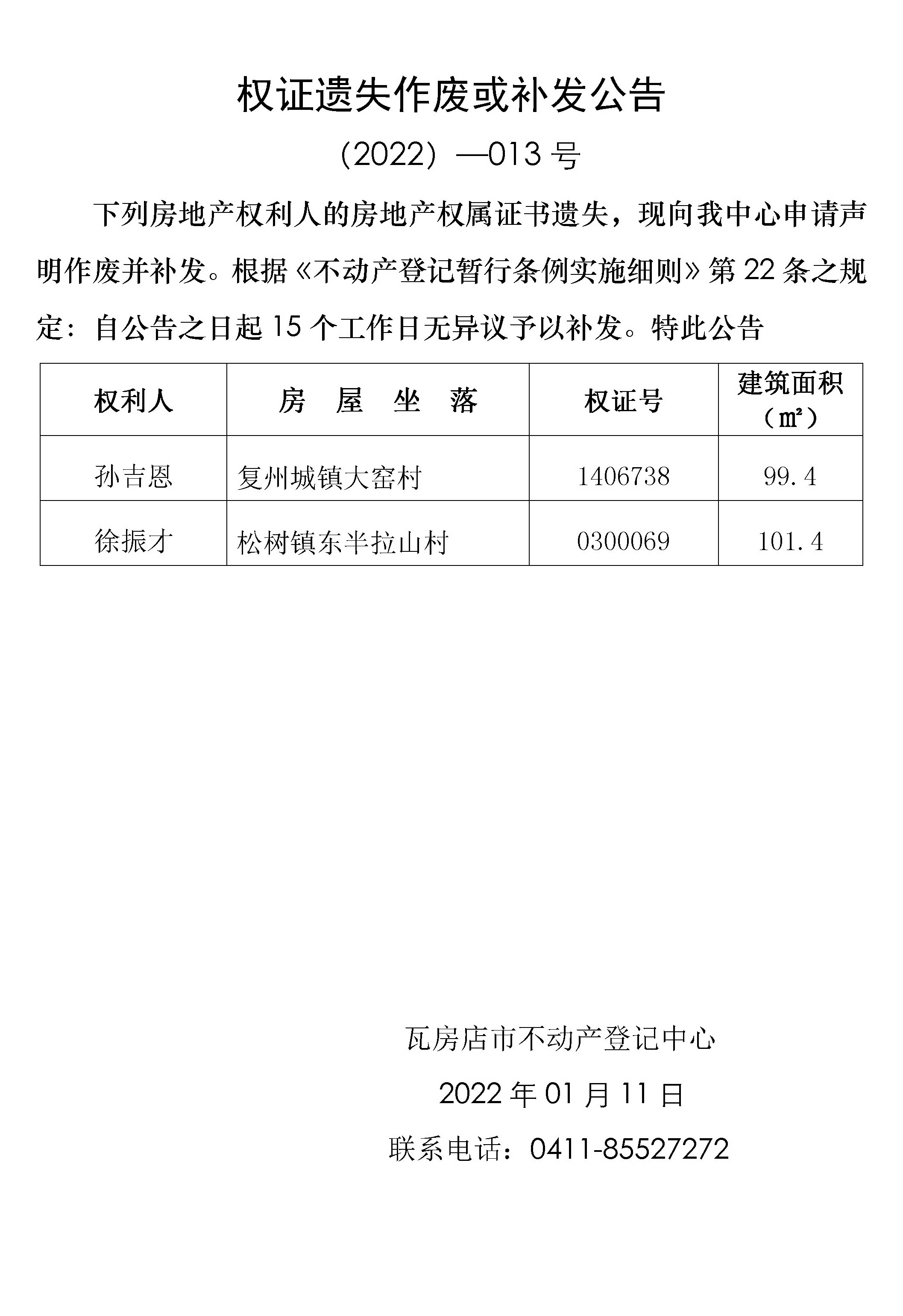 注销不动产权利证书公告 (2022)-012号