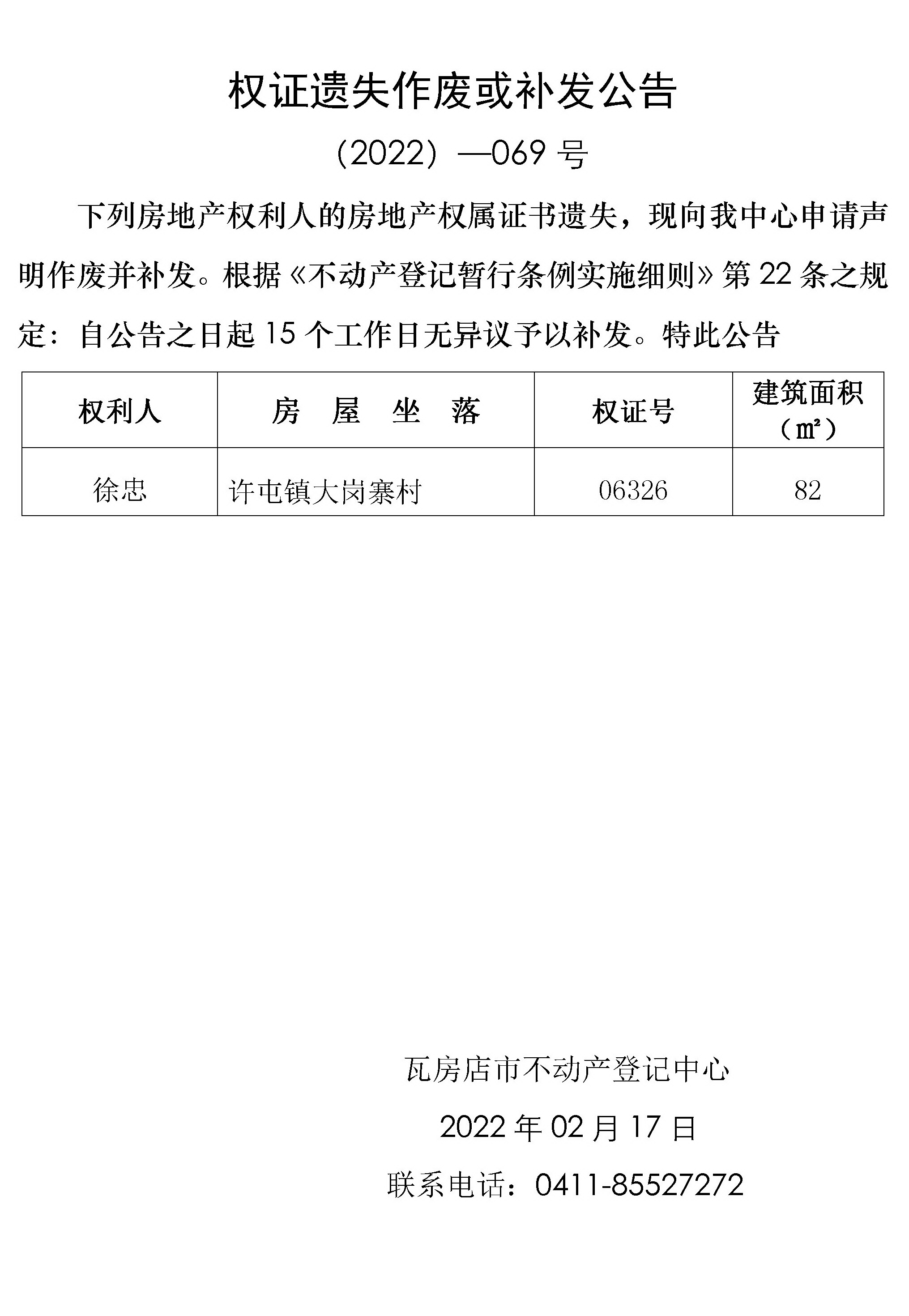 宅基地使用权及房屋所有权首次登记公告 (2022)-069号