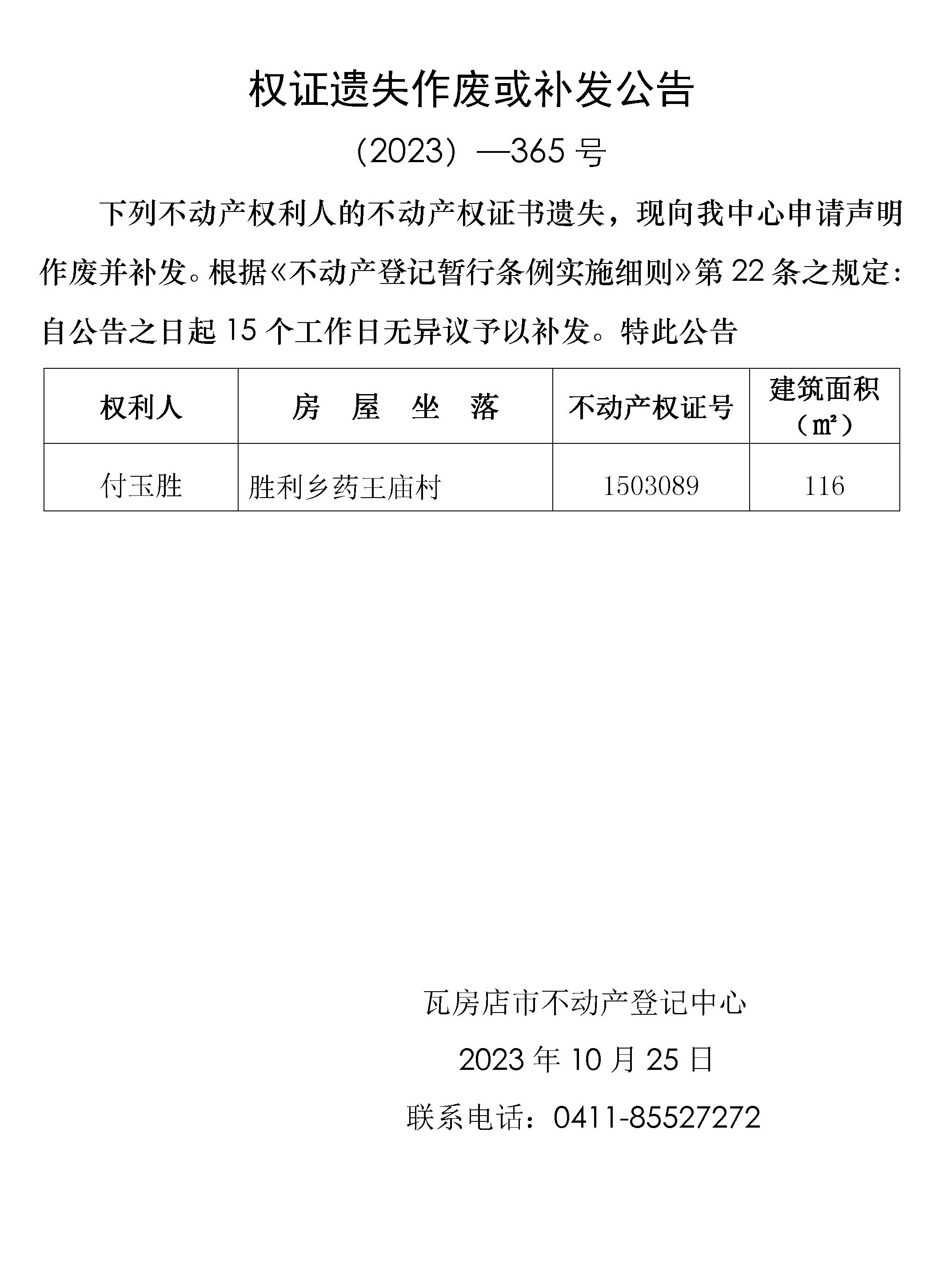 权证遗失公告 (2023)-365号