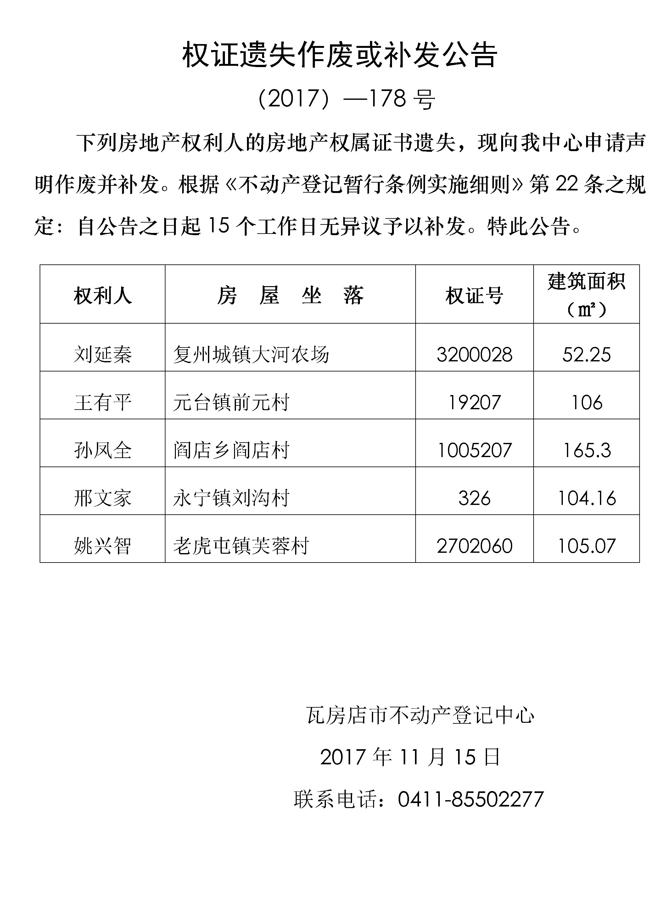 宅基地使用权及房屋所有权首次登记公告 (2017)-177号
