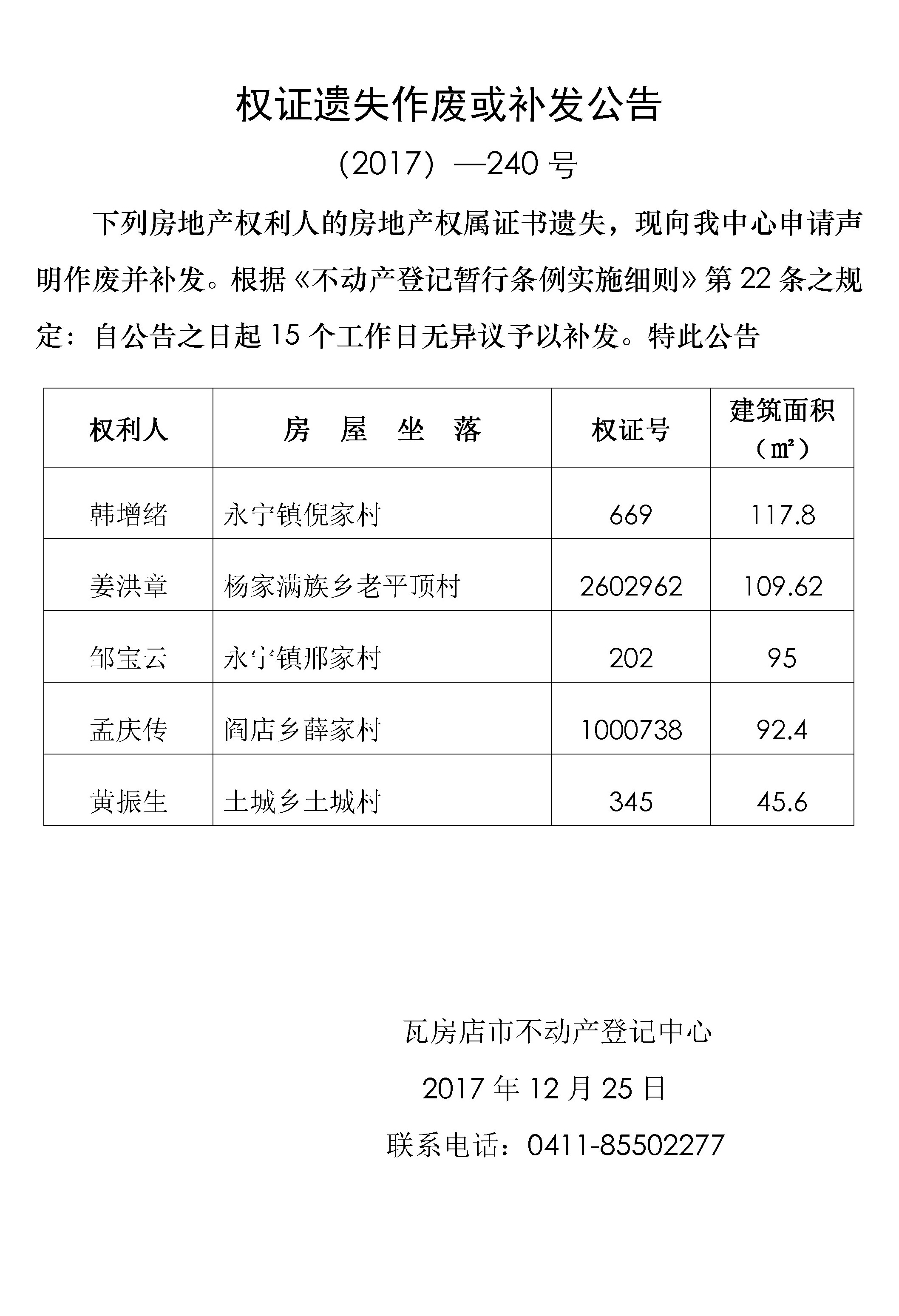 宅基地使用权及房屋所有权首次登记公告 (2017)-239号