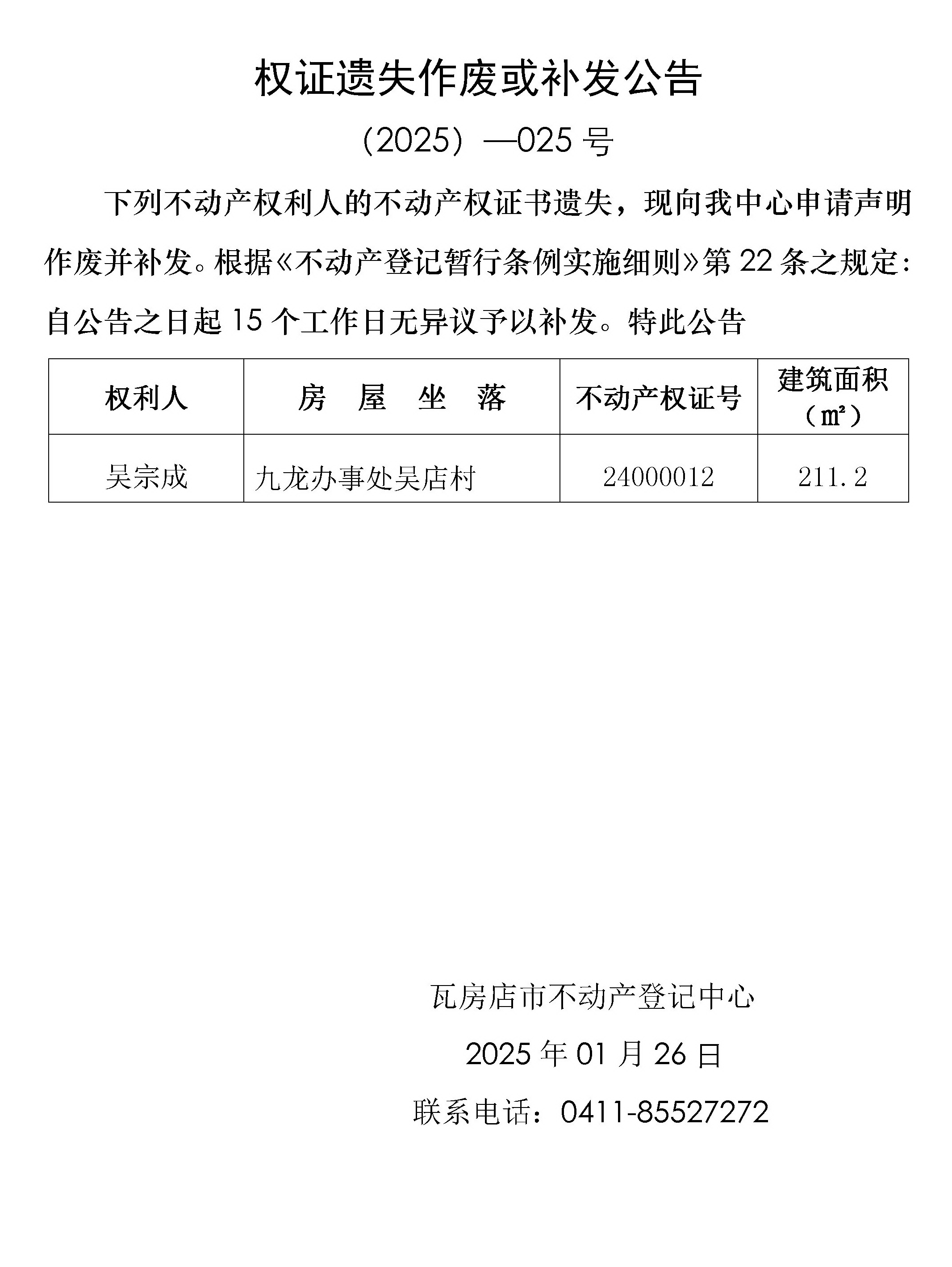 宅基地使用权及房屋所有权首次登记公告 (2025)-024号