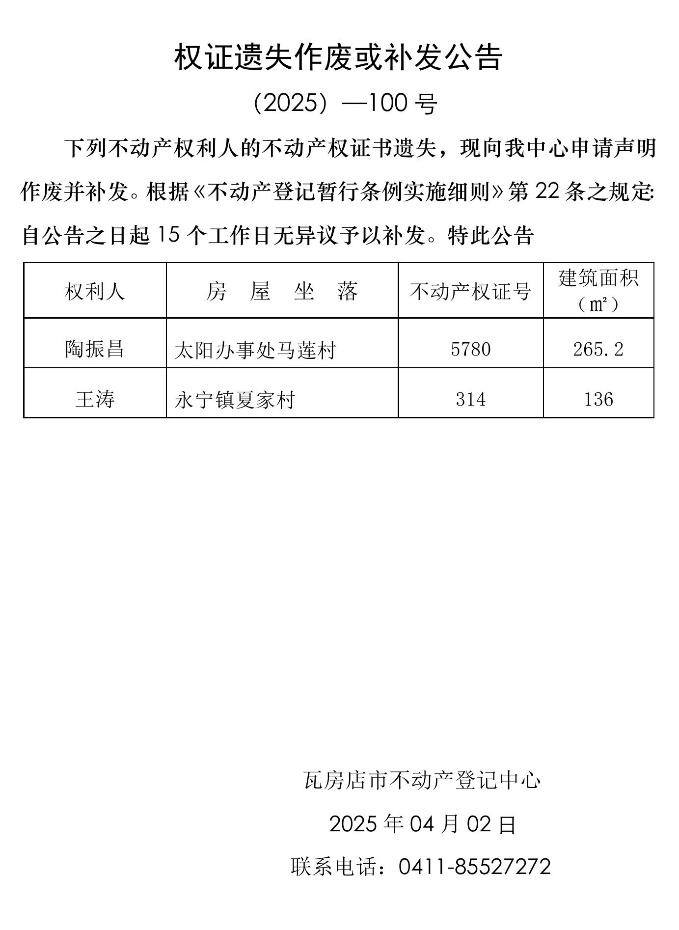 权证遗失作废或补发公告 (2025)-100号