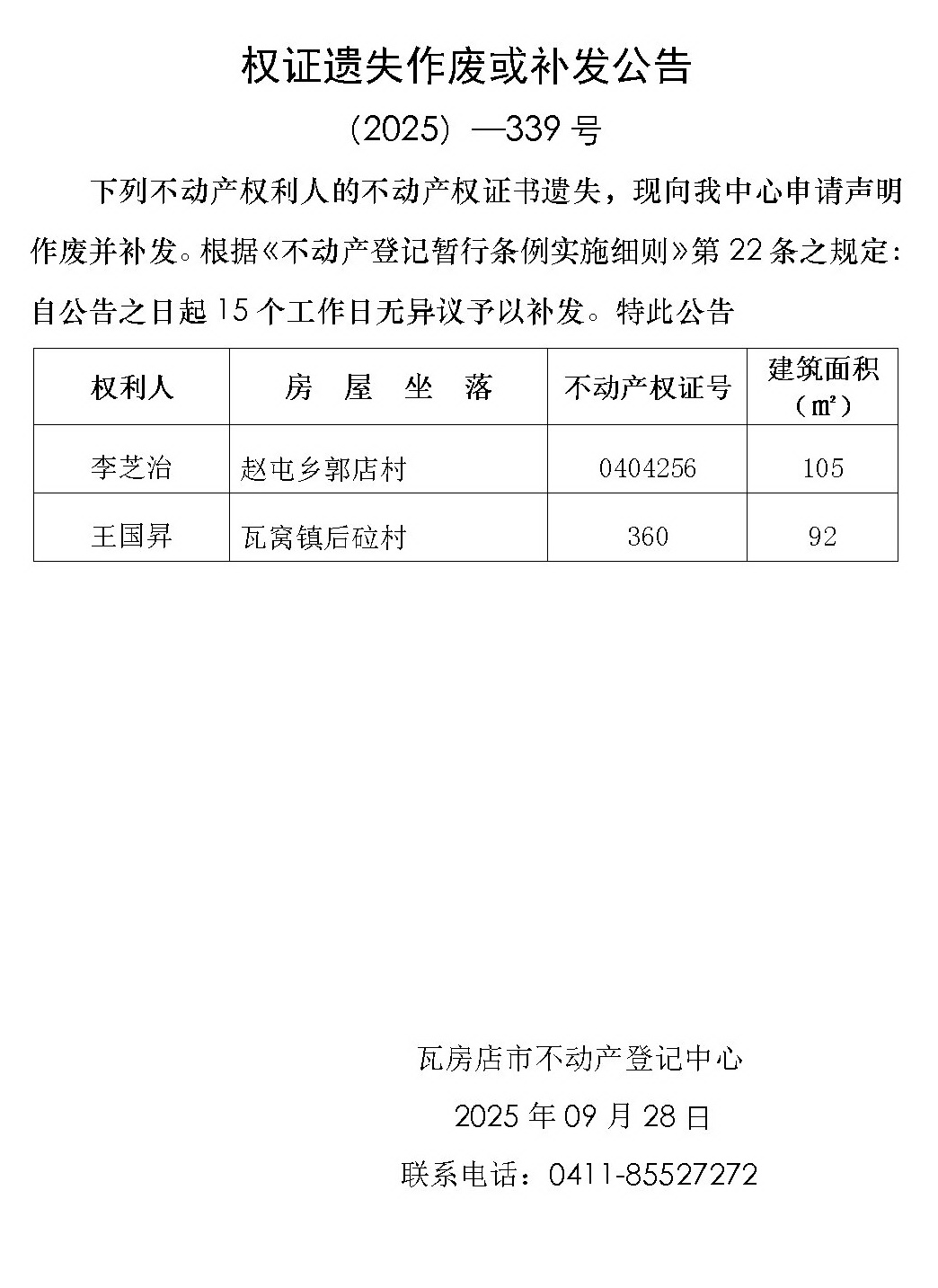 宅基地使用权及房屋所有权首次登记公告 (2025)-338号
