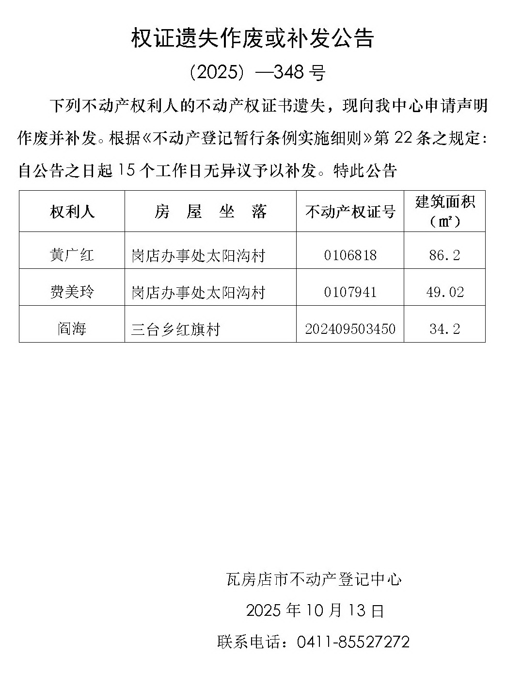 权证遗失作废或补发公告 (2025)-348号
