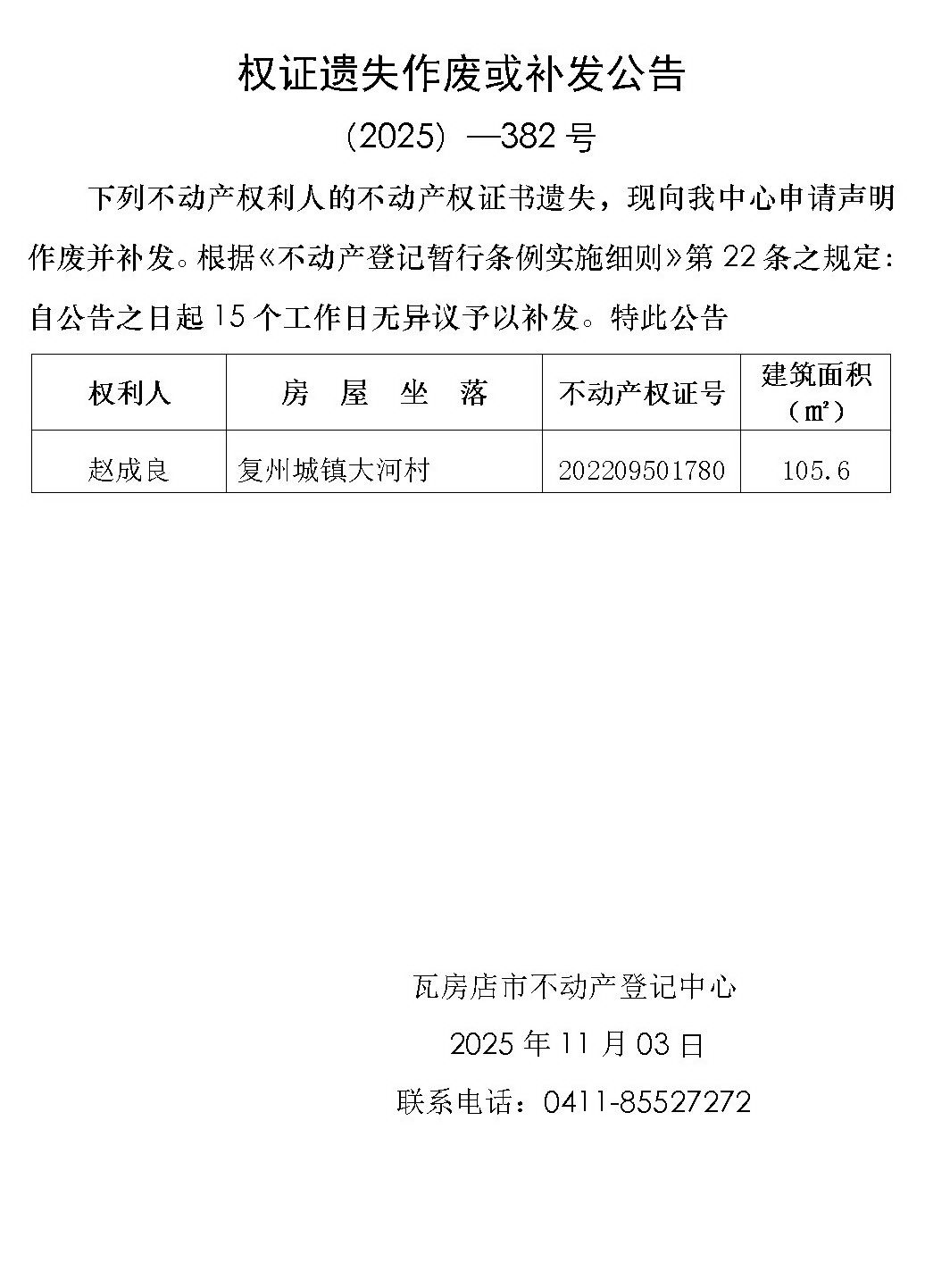 权证遗失作废或补发公告 (2025)-382号