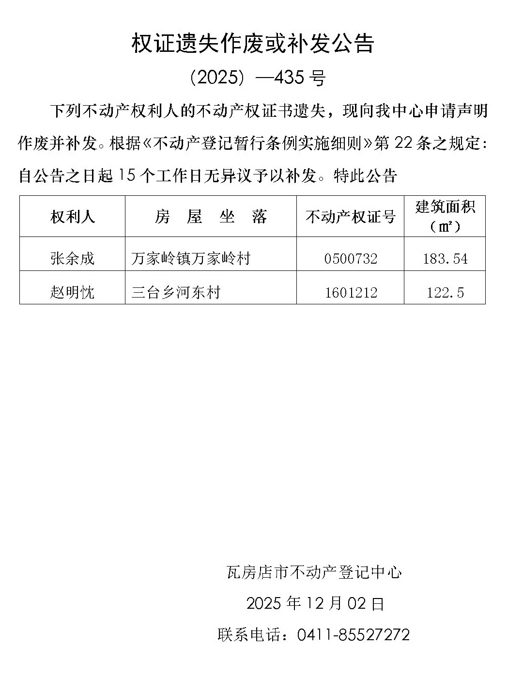 权证遗失作废或补发公告 (2025)-435号