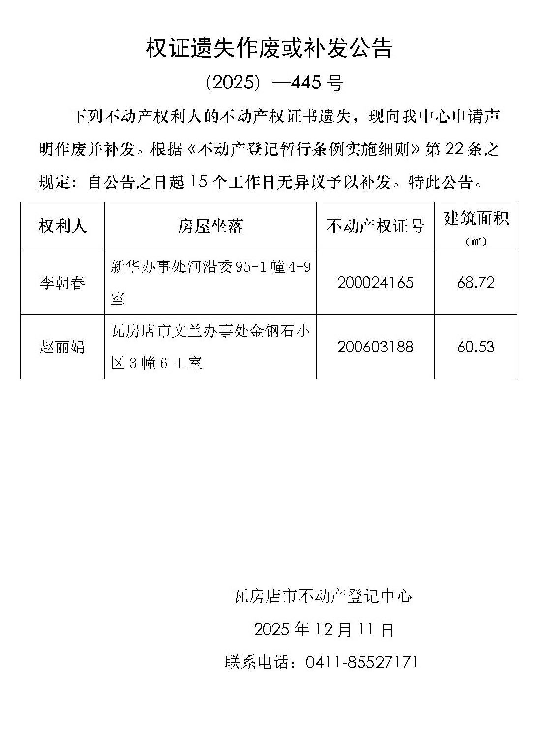 宅基地使用权及房屋所有权首次登记公告 (2025)-446号
