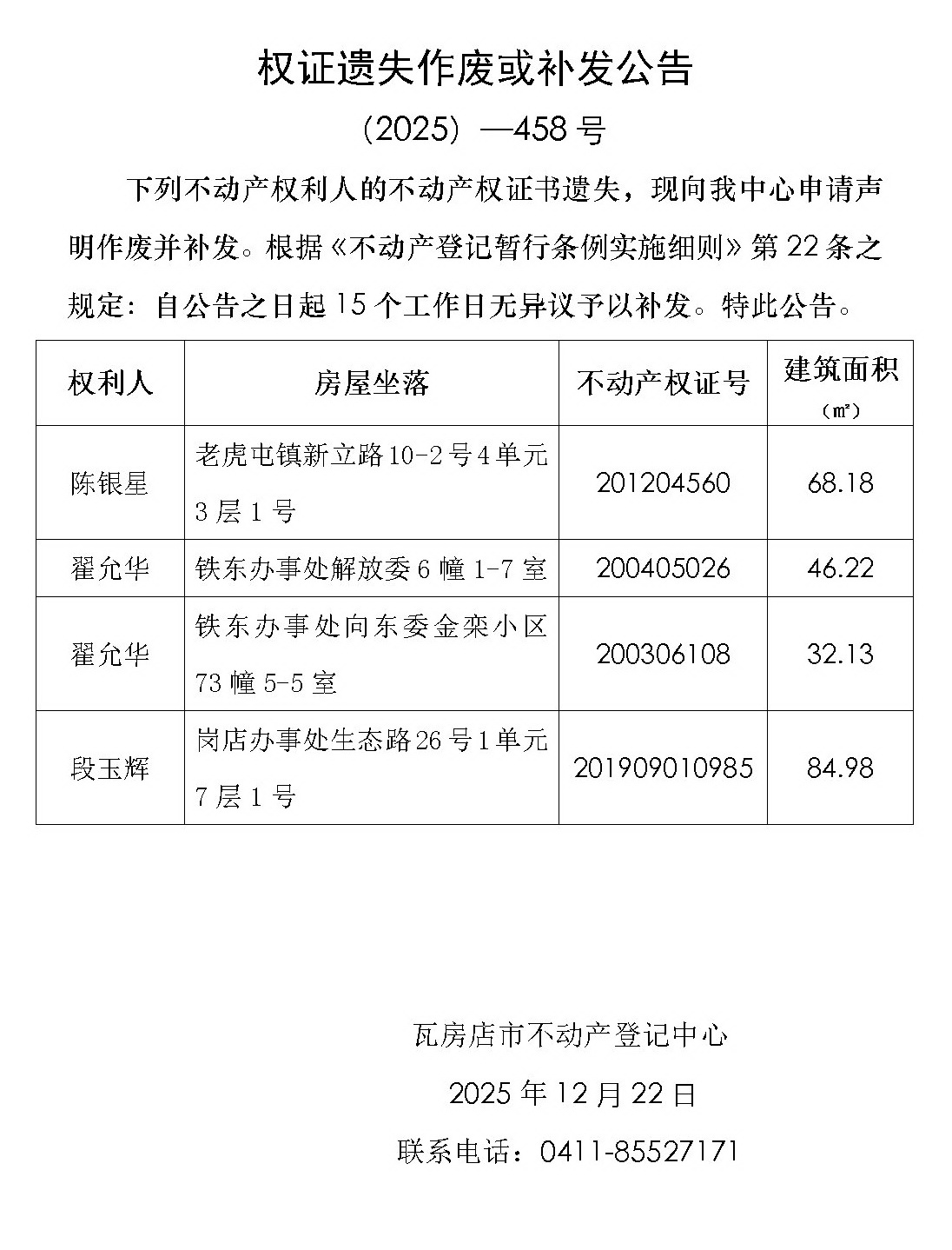 权证遗失作废或补发公告 (2025)-458号