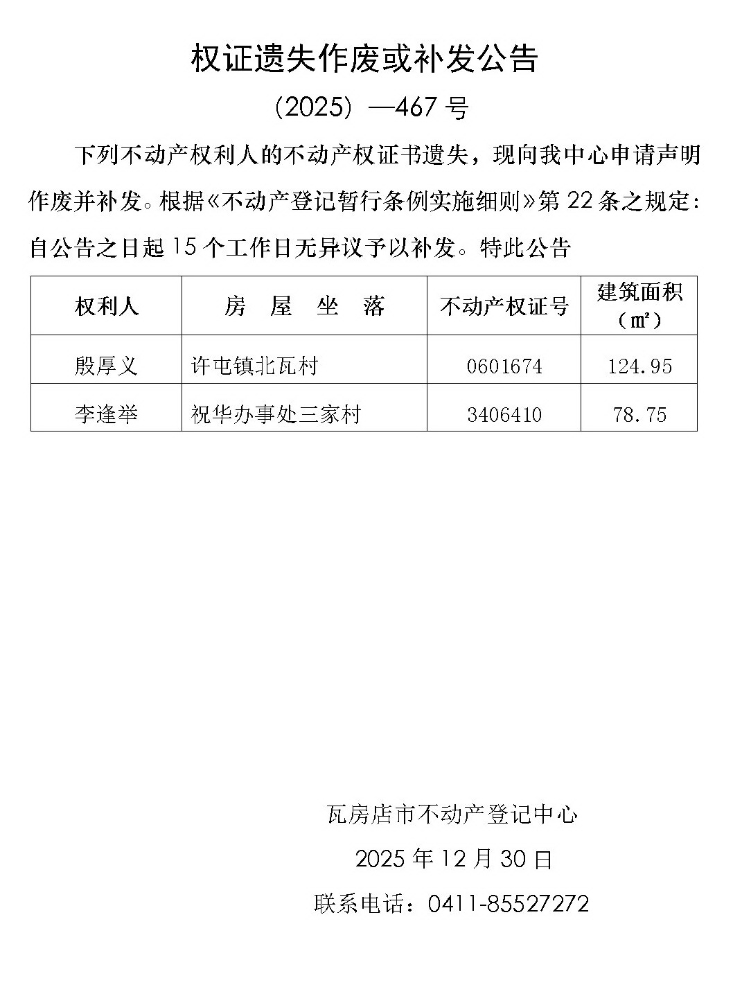 权证遗失作废或补发公告 (2025)-467号