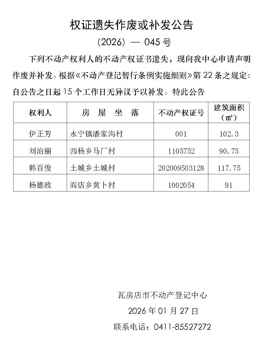 权证遗失作废或补发公告 (2026)-045号