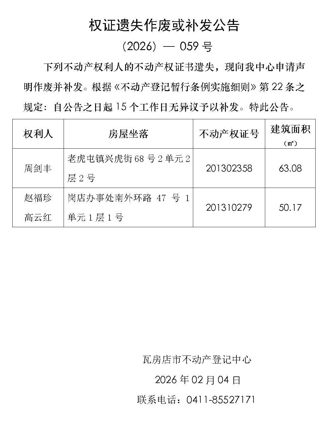 宅基地使用权及房屋所有权首次登记公告 (2026)-058号