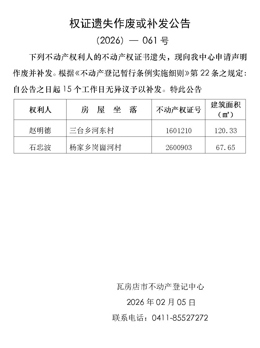 权证遗失作废或补发公告 (2026)-061号