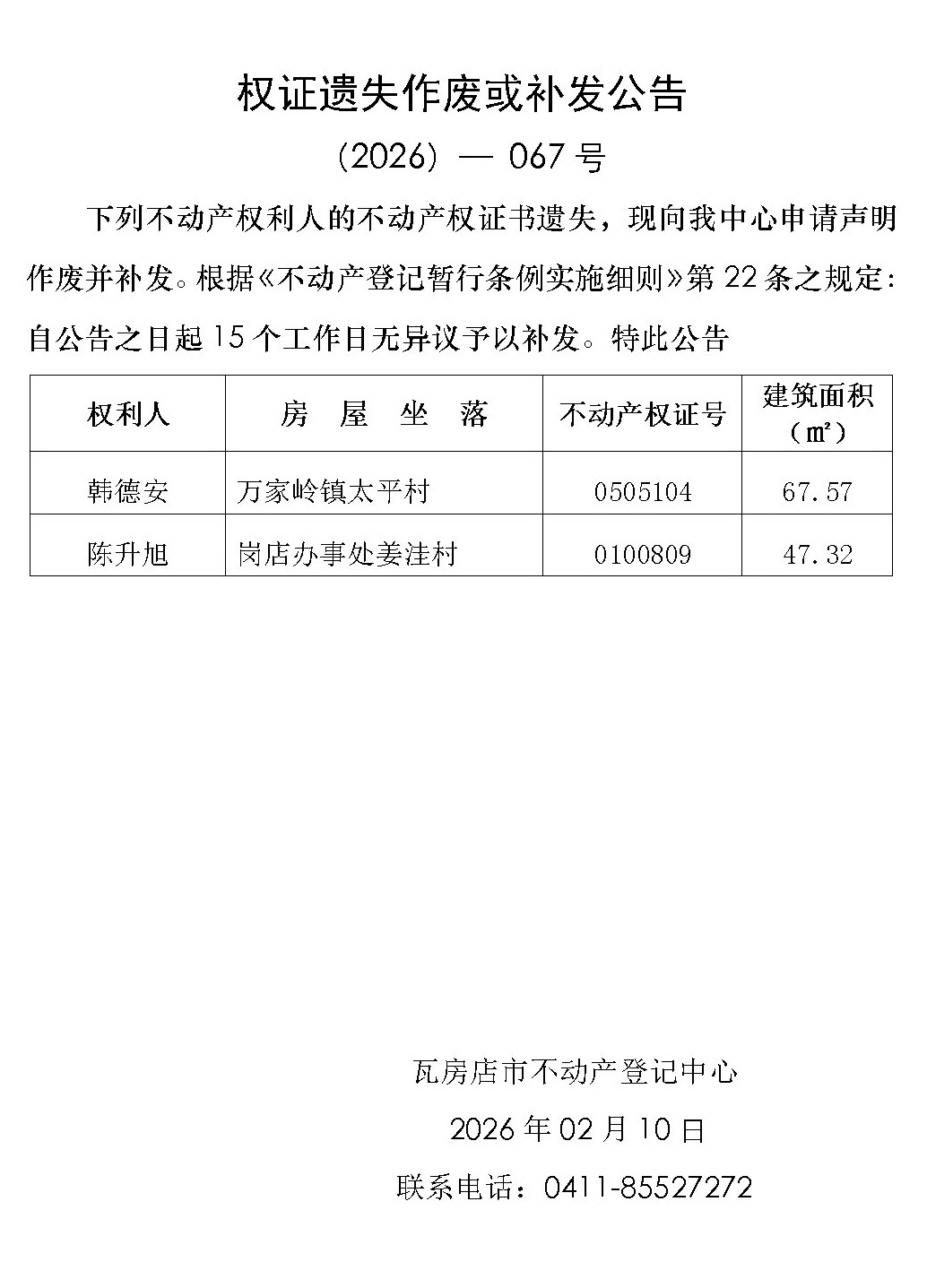 宅基地使用权及房屋所有权首次登记公告 (2026)-066号