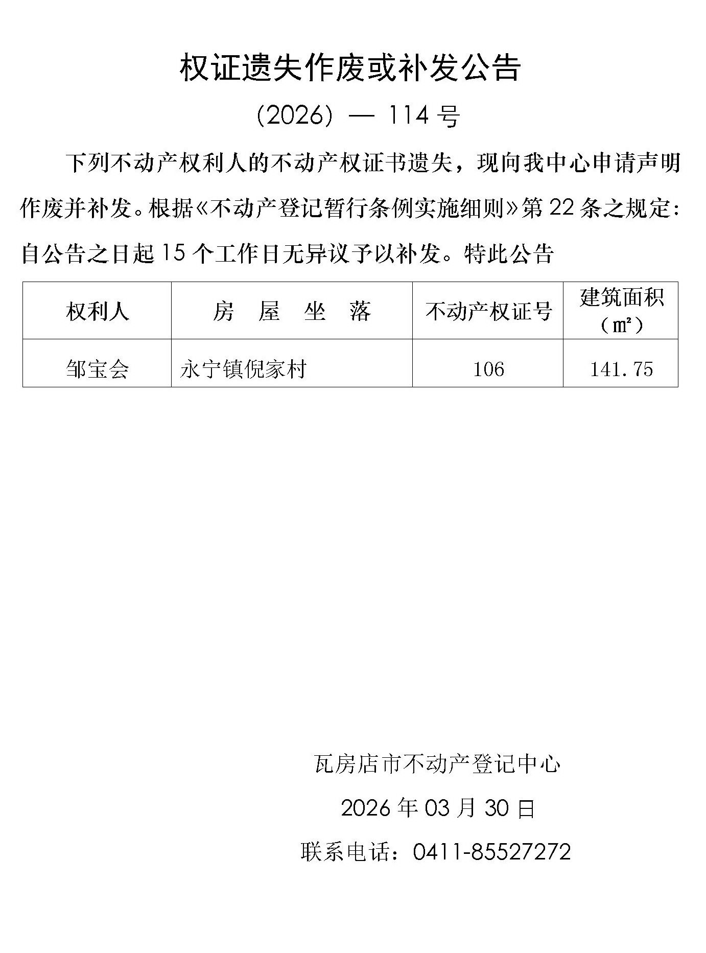 权证遗失作废或补发公告 (2026)-114号