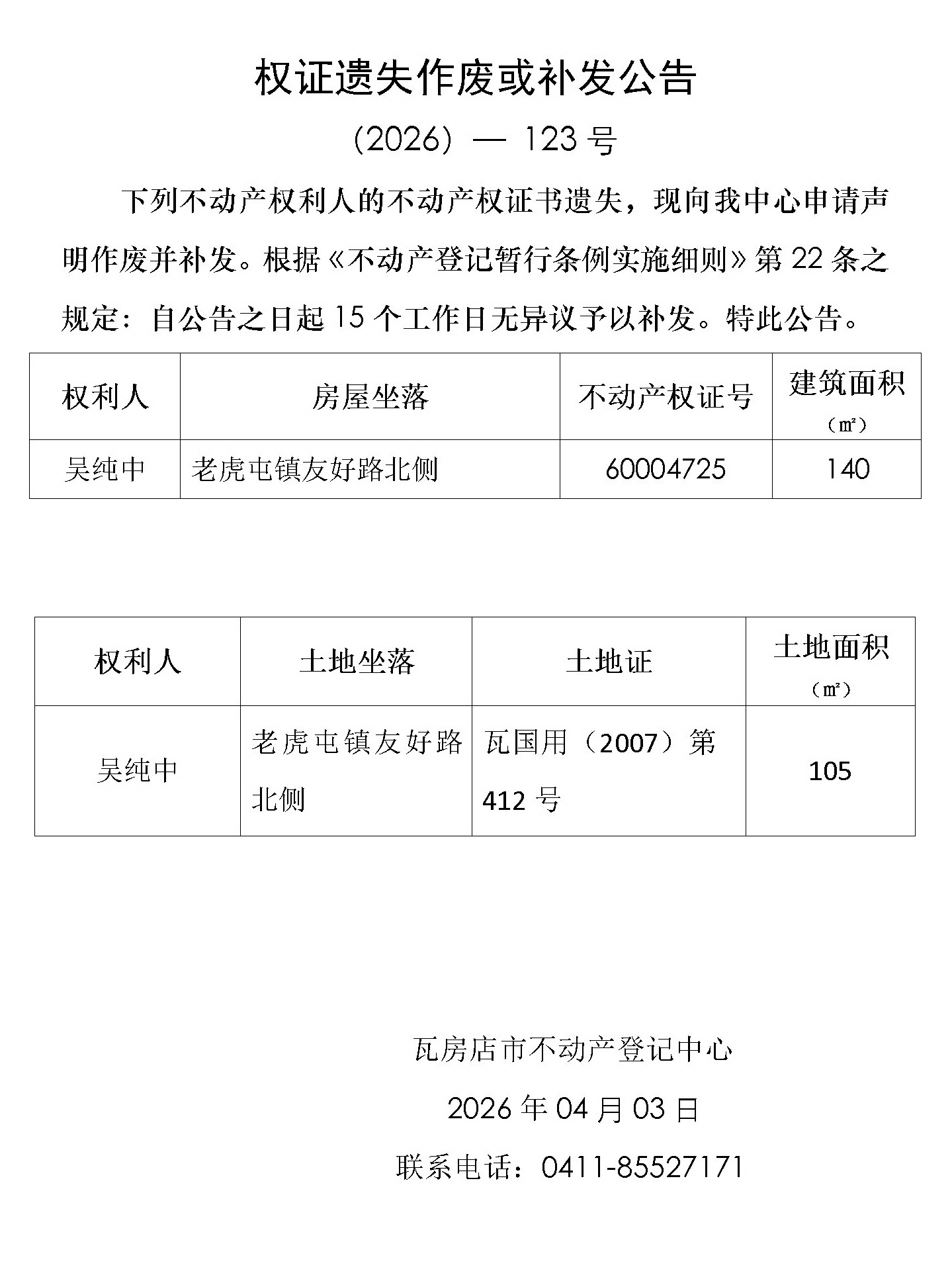 权证遗失作废或补发公告 (2026)-123号