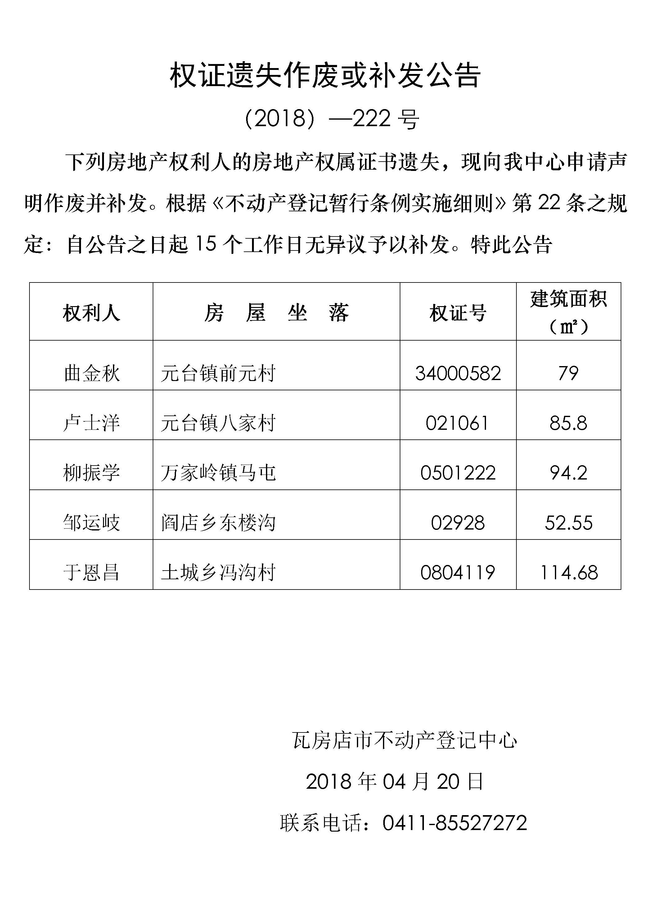权证遗失公告 (2018)-222号
