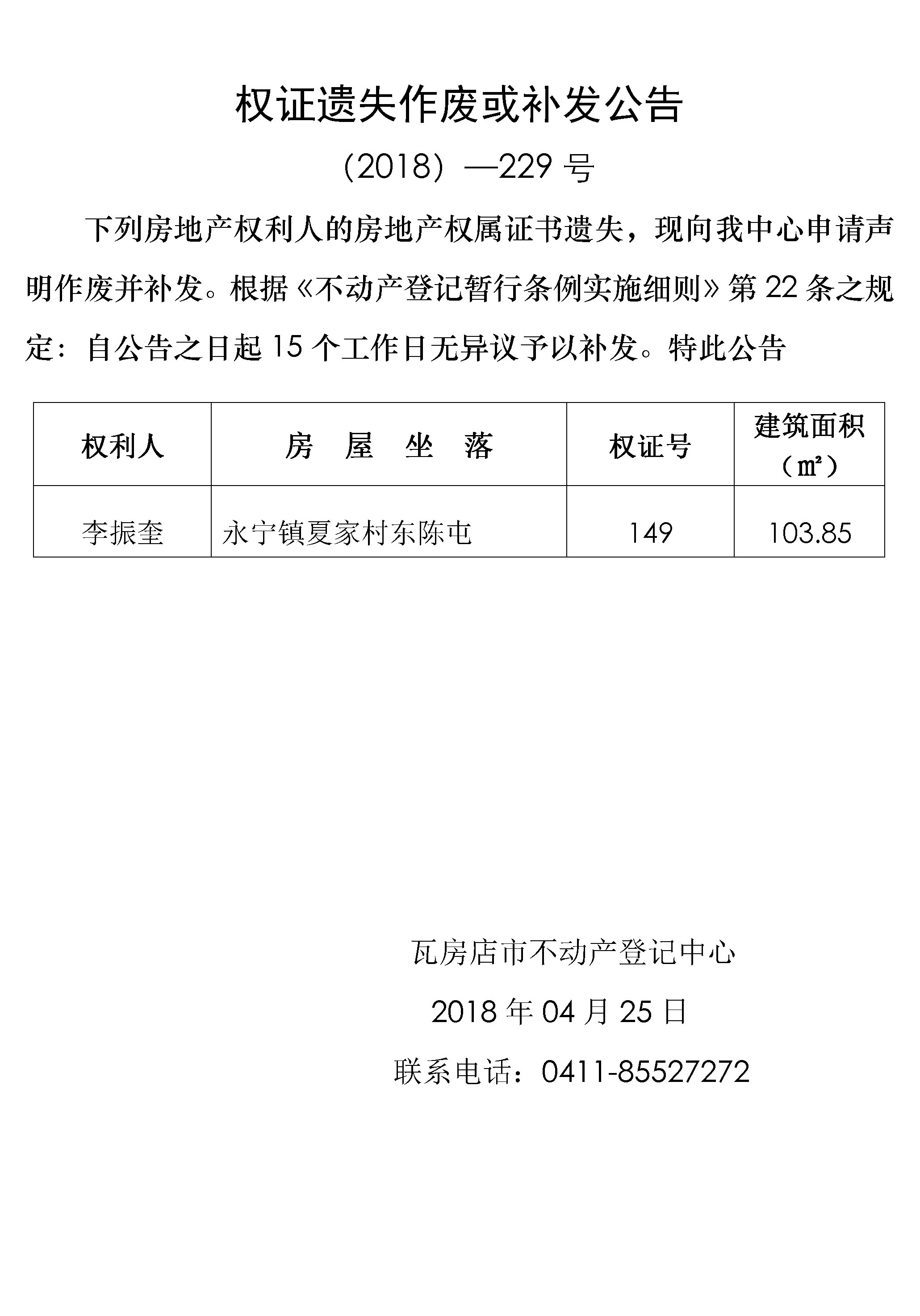 宅基地使用权及房屋所有权首次登记公告 (2018)-228号