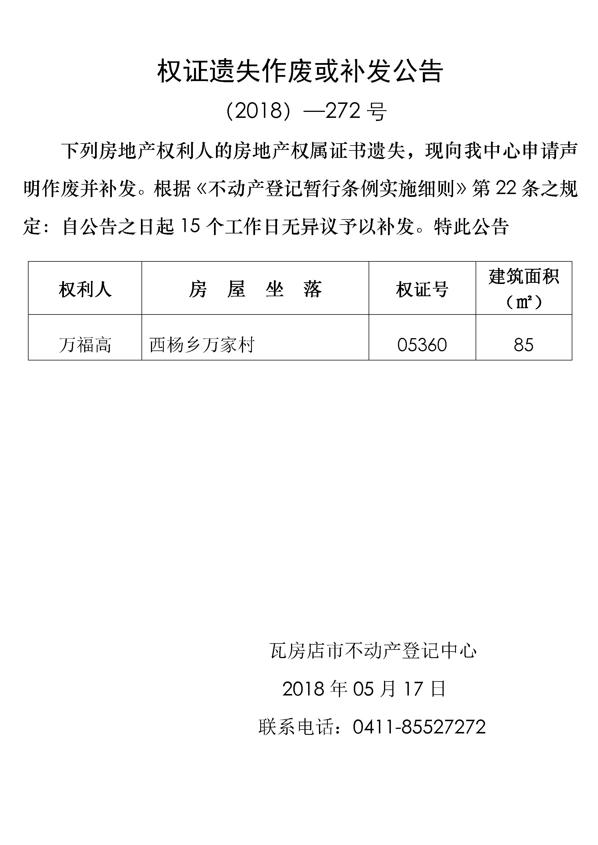 权证遗失公告 (2018)-272号