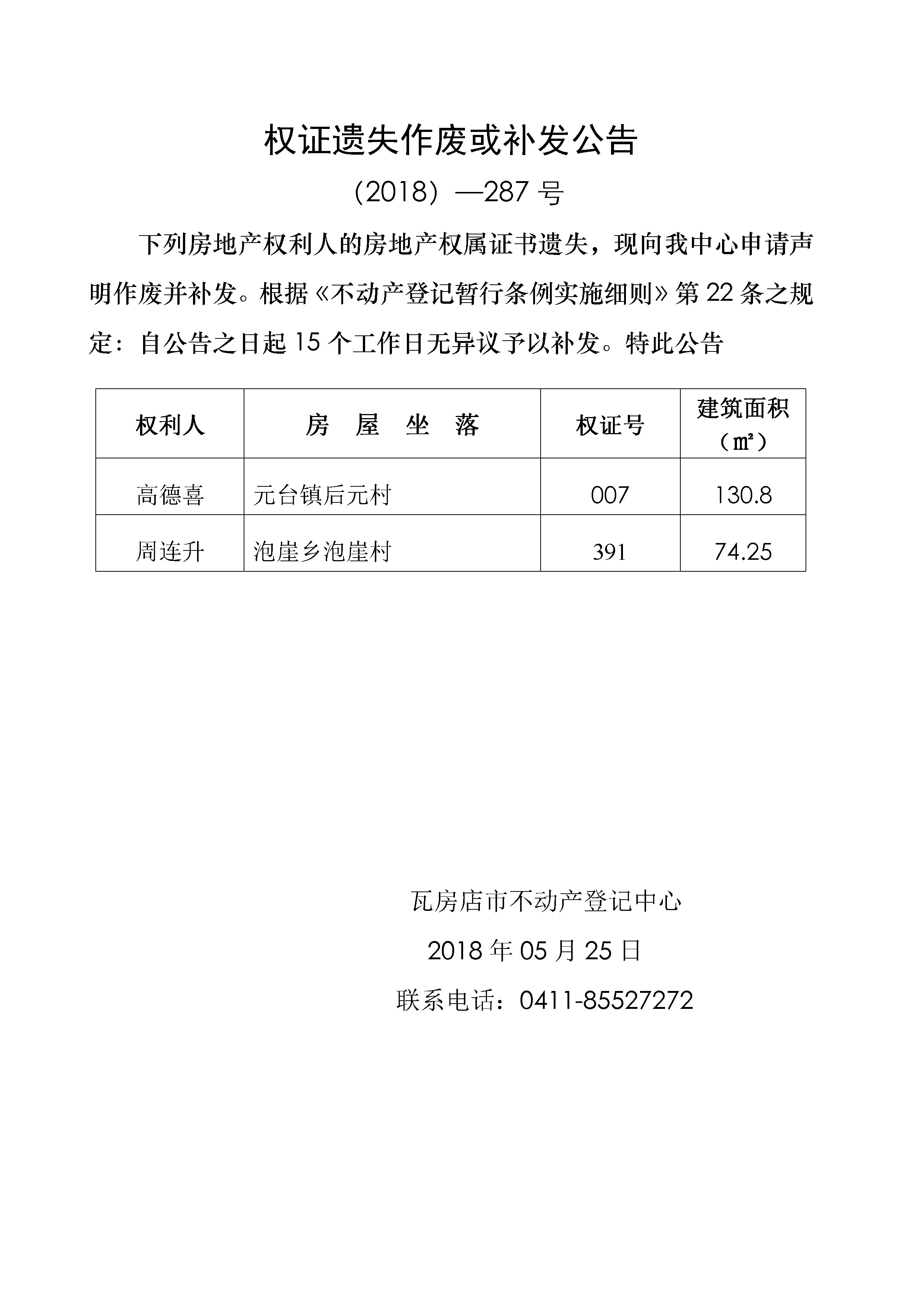 宅基地使用权及房屋所有权首次登记公告 (2018)-288号