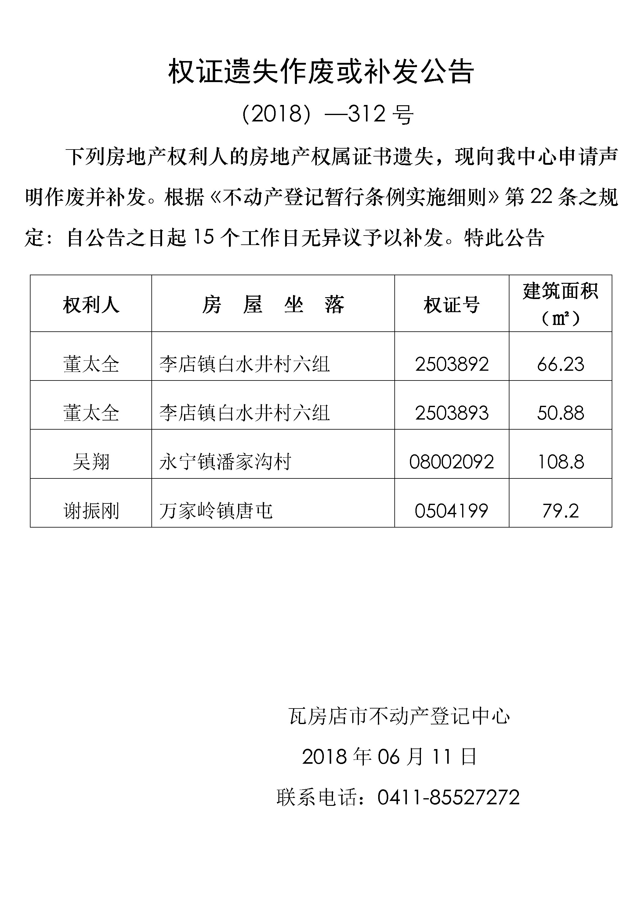 不动产转移登记公告 (2018)-311号